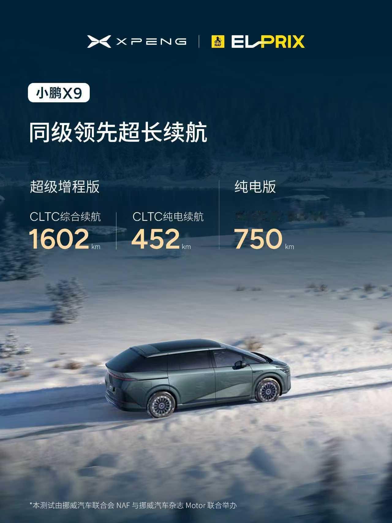 得益于“充得快”与“能耗低”的双重优势,小鹏X9超级增程版 CLTC综合续航1602km、CLTC纯电续航452km,纯电版至高CLTC纯电续航750km,实现同级领先。小鹏X9获挪威权威机构冬季充电实测第一