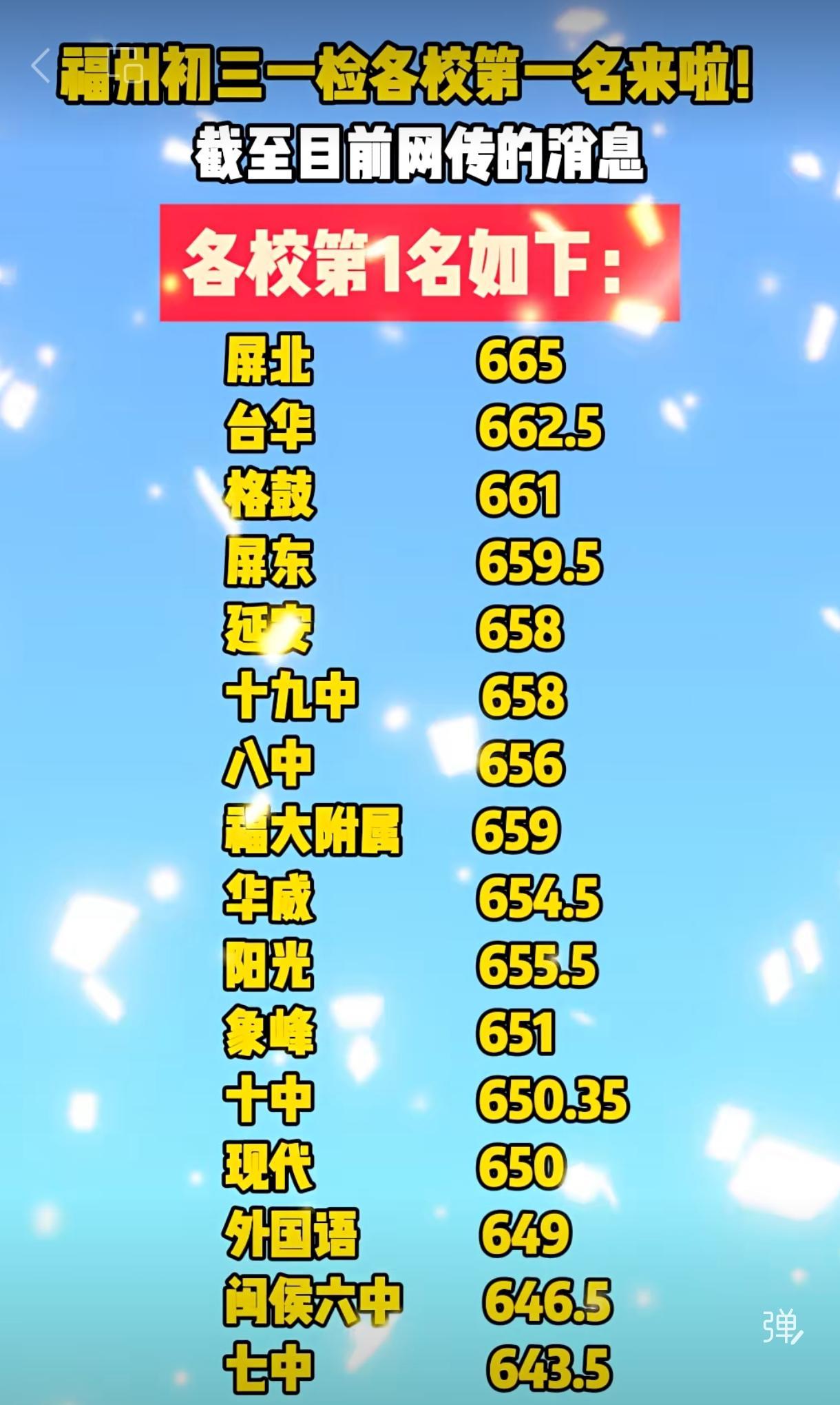 2026年福州初三一检各校第一名来啦!刚出分的福州初三毕业生群家长群彻底炸了,今年福州市区的一检考试,从初三考生吐槽,到一检总分的分数段数据,都讲述了同一个问题:2026年的这一次初三一检,是近四年最难的一次一检!没有更难!650 分以上仅 51 人(其中去年2025 年 77 人),635 分以上仅 365 人(其中去年2025 年超 600 人)。对应福州六区主城区老九所的高保线(3900 名)从 2025 年的 597 分下降到2026年的 595 分,降低分数,说明考试难度加强。结论:2026 福州一检成 “近年最难”?!杀出一匹黑马:不是华伦、不是屏东、不是延安,一检最高分桂冠被屏东中学的屏北分校考生夺取!福州初三一检卷 福州高三提分 福州初三试卷 福州一检排名 福州一检切线 福州英语一检 福州一检作文 收藏并关注