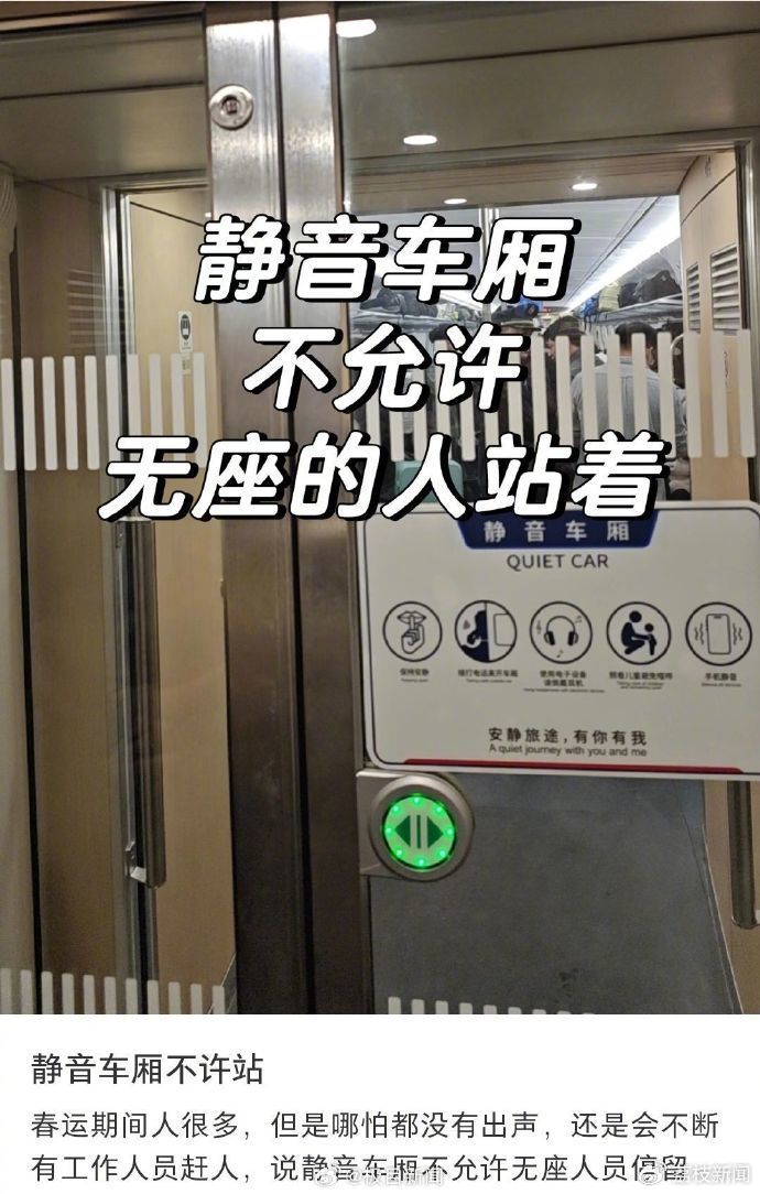 有网友质疑,无座乘客同为购票旅客,身处静音车厢却被劝离,这类行为在规则执行上过于僵化。实则不然,静音车厢的核心价值,是为主动选择它的旅客提供“付费买安静”的体验。旅客购票时需主动勾选同意静音条款,铁路部门则通过不售无座票、推行轻声服务等方式兑现约定。即便无座乘客保持安静,其流动、站立仍会带来潜在干扰。