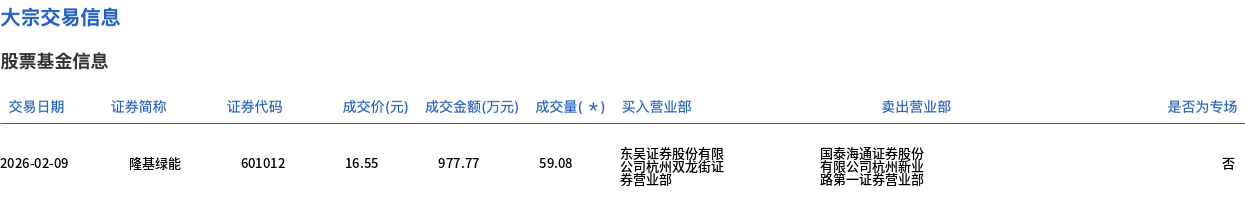2月9日,隆基绿能大宗交易成交59.08万股,成交额977.77万元,占当日总成交额的0.12%,成交价16.55元,较市场收盘价19.18元折价13.71%。