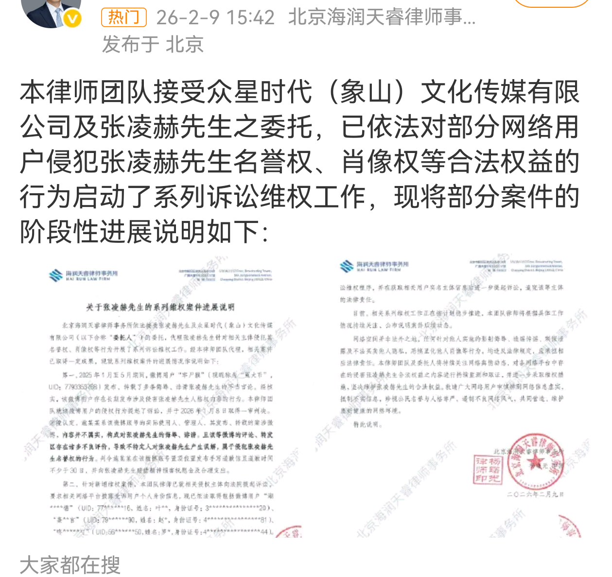 张凌赫方公布维权最新进展 刘大锤回应张凌赫单身