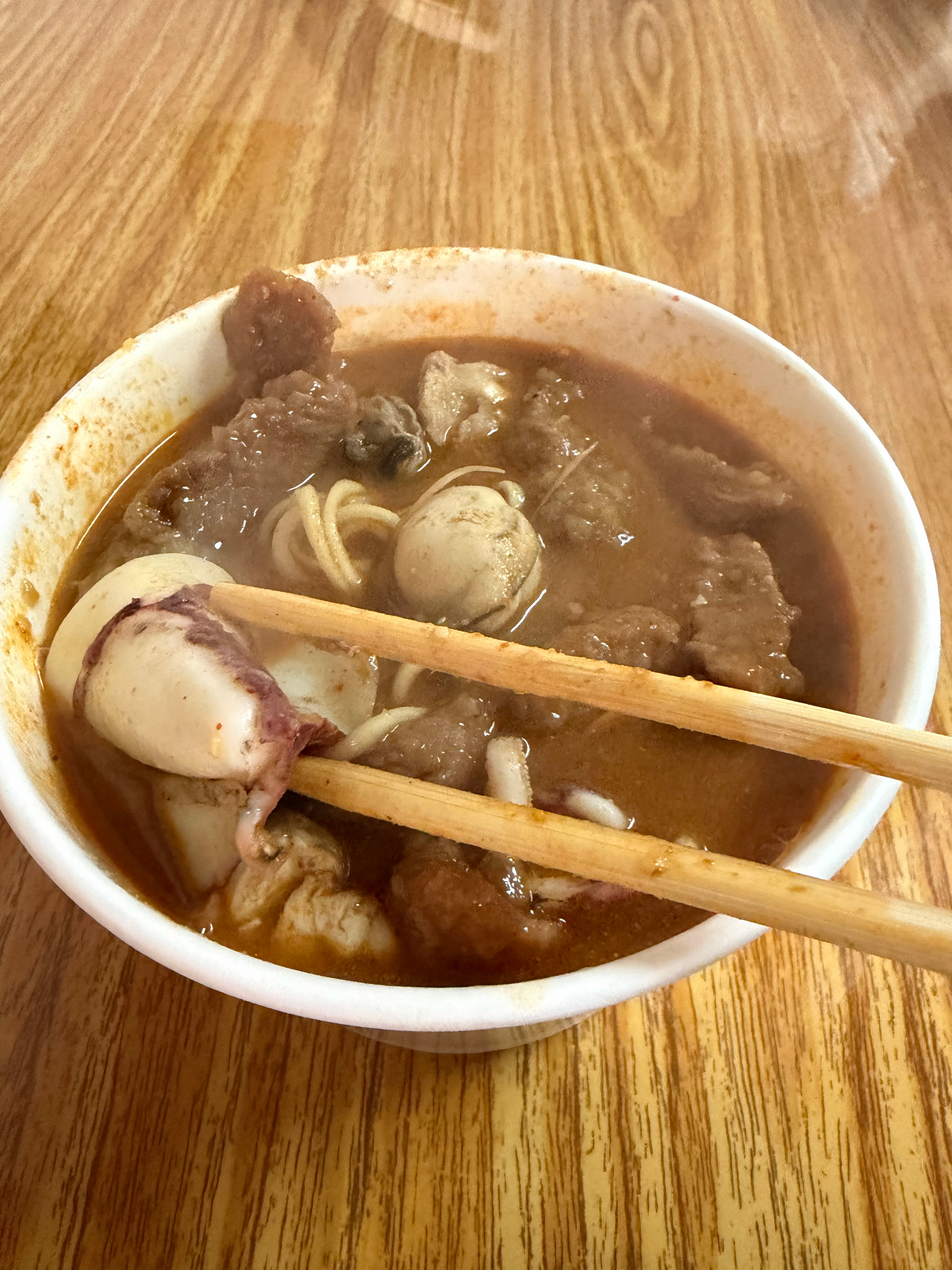 藏在街角的老店,这一碗海鲜沙茶面加了鱿鱼、牡蛎、牛肉,很新鲜,猜猜多少钱?