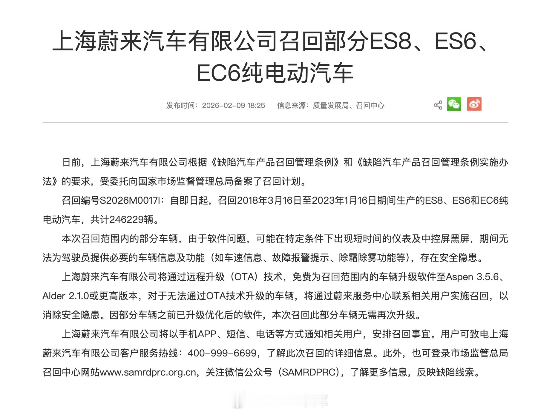 蔚来召回得有点多,2018 年 3 月 16 日至 2023 年 1 月 16 日期间生产的 ES8、ES6 和 EC6 纯电动汽车,共计 246,229 辆。