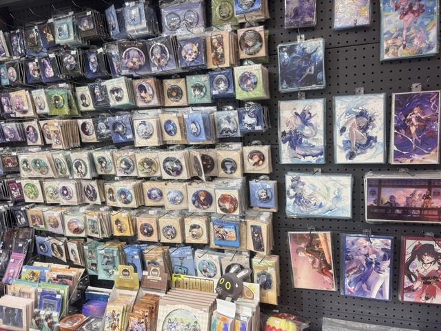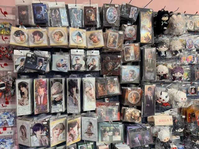 小安负责店里部分进货工作,她放低声音说,“我还可以‘夹带私货’,进一些我推的游戏角色的谷子。”她有条不紊地将一个个棉花玩偶装进透明塑封袋,再挂到货架上。做完这一套行云流水的动作,她满意地观赏起自己的成果:大半面的架子上摆满了她喜欢的乙游周边,吧唧(徽章)、立牌、小卡、镭射纸、玩偶……