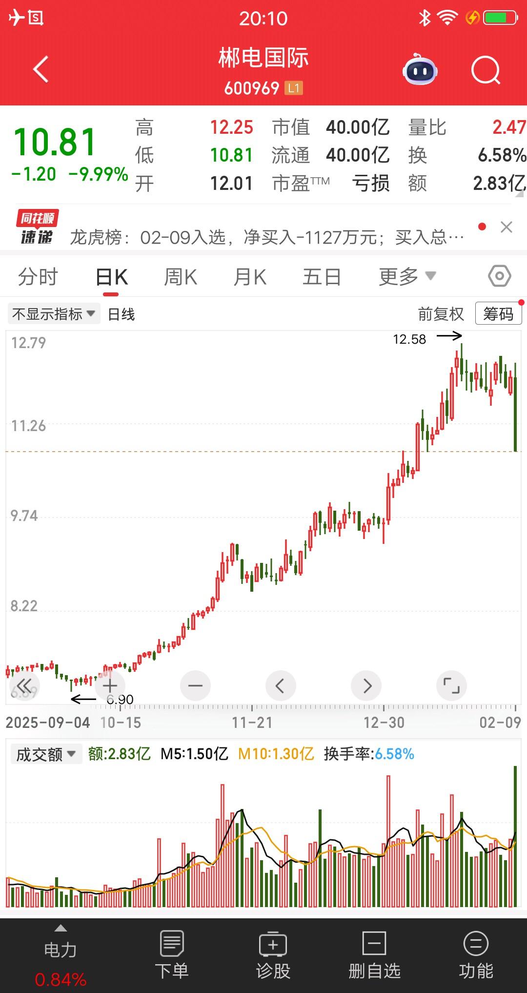 电力板块今天最惨的票诞生了,零轴附近窄幅震荡了大半天,主力开始小幅拉升诱多。盯盘的散户以为要起飞了,果断追入,此后快速回落,然后一头扎向地板,按死跌停。整个电力板块,就这一只跌停股。 主力和散户玩的就是心理战,一直横盘不涨,然后突然明显拉升,散户会觉得要涨了,于是就入套了。当天浮亏十几个点,惨呀! 杀跌也是正常的,因为已经涨很多了,主力也需要出货。没有只涨不跌的票,做错了就得认。