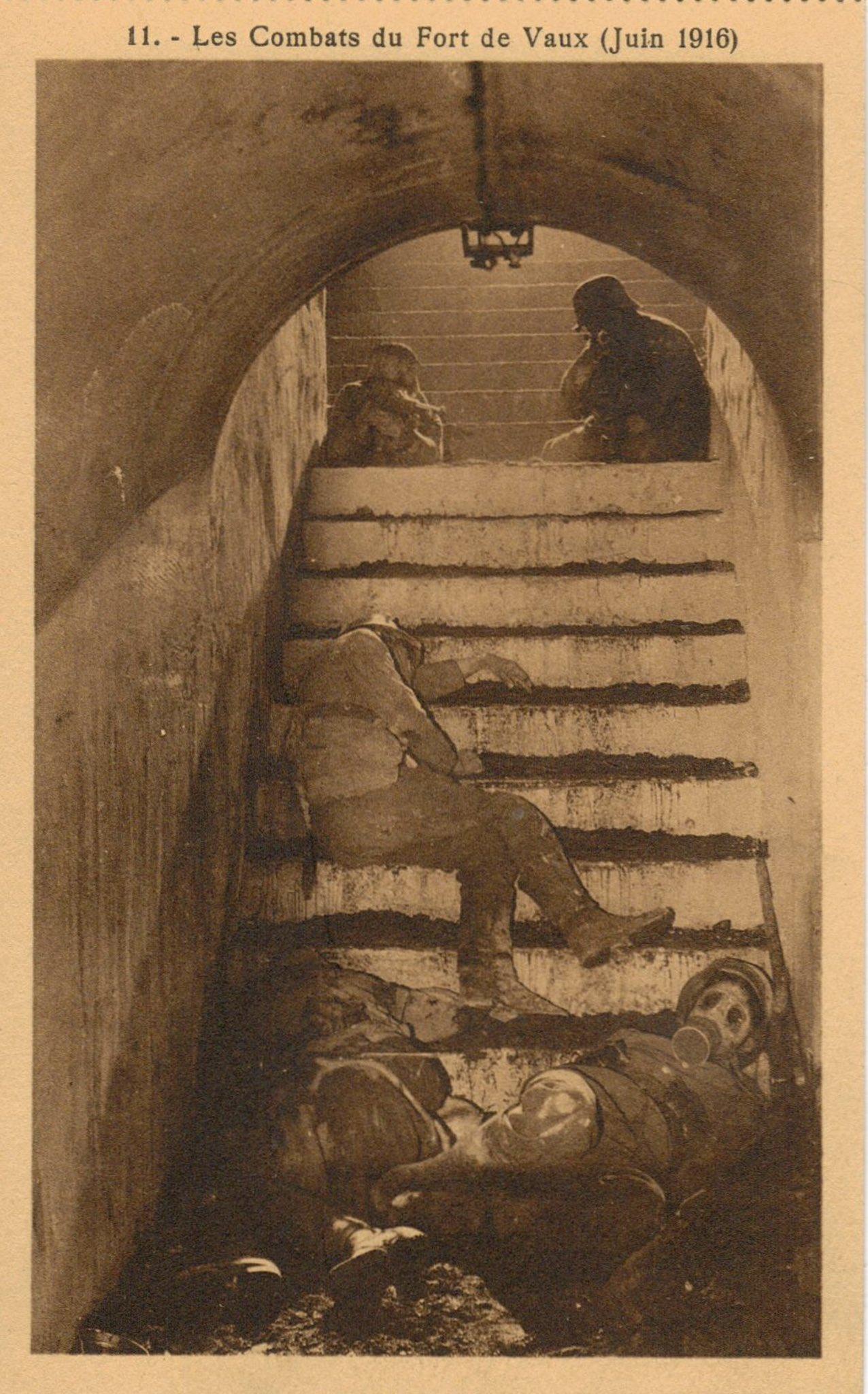 一张罕见的1916年照片,照片中,戴着防毒面具的法国士兵倒在沃堡内的楼梯上,横七