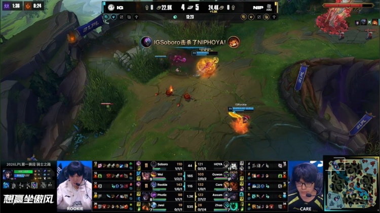 [13:23]Rookie狐狸去上轻松帮助Soboro贾克斯击杀HOYA纳尔,Assum厄斐琉斯推掉iG下路一塔,NIP拿到小龙,本局为风龙魂。