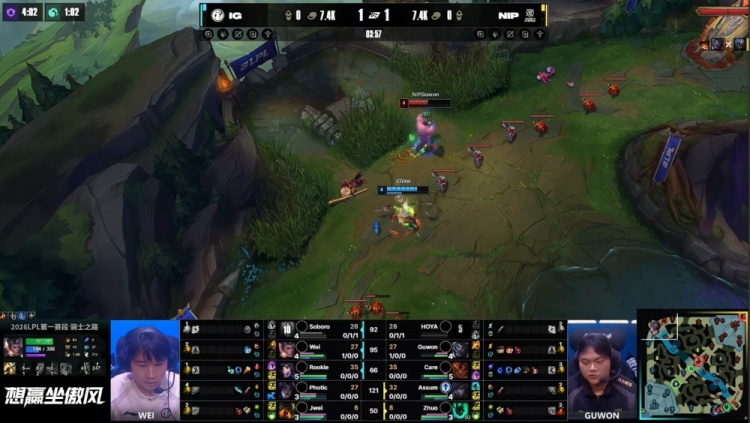 [14:58]上路三角草团战,Wei赵信捅飞Care岩雀,先锋团,Guwon蒙多龙坑游龙双杀,Soboro贾克斯送Care人头,NIP打出2换4,Guwon拿到先锋。