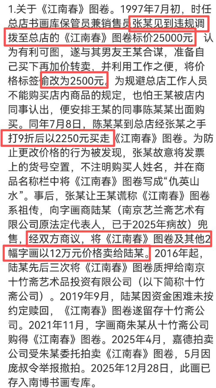 南博文物事件24人被处理通报提到南博员工倒卖文物的具体细节,其贪得无厌的嘴脸太逗了,1997年,在今天拍卖估价8800万的《江南春》,被违规调拨到南博总店销售,标价才2万5,已经是骨折捡漏价了(差了3520倍),这员工还不知足,先把2万5的售价打1折改成2500,接着让男友的同事,以9折2250元买走,最后以12万转卖出去,净赚50倍...