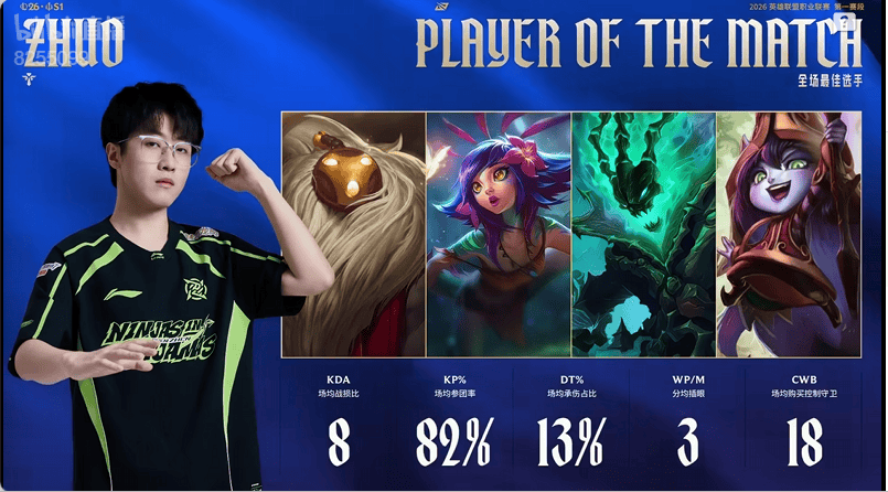 虎扑02月09日讯金杯共汝饮,白刃不相饶,Zhuo斩获NIP对阵IG的全场MVP