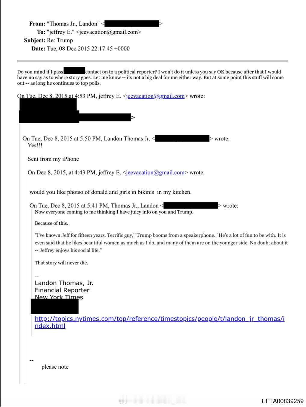2015年12月的电子邮件显示,记者小兰登·托马斯曾向爱泼斯坦索要有关特朗普的劲爆内幕。爱泼斯坦则提供了“唐纳德和穿着比基尼的女孩在我厨房里的照片”(似乎未被公布)。