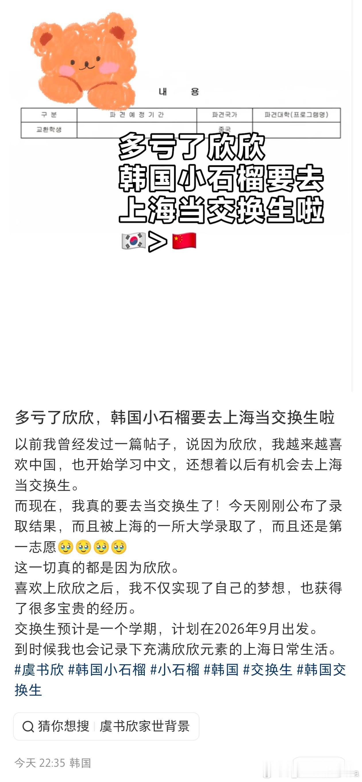 因为虞书欣 越来越喜欢🇨🇳 开始学习中文 想着有机会去上海当交换生现在这个小石榴真的做到了!!!第一志愿录取了太棒了