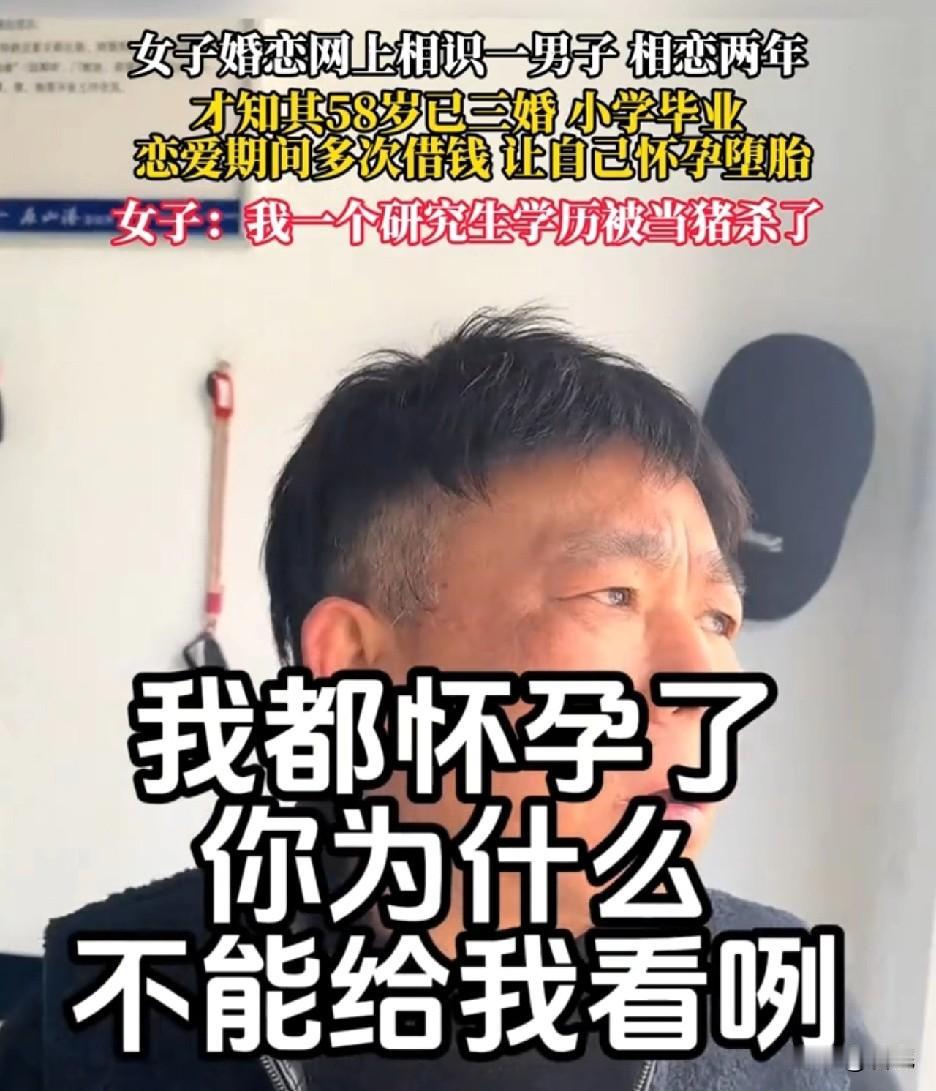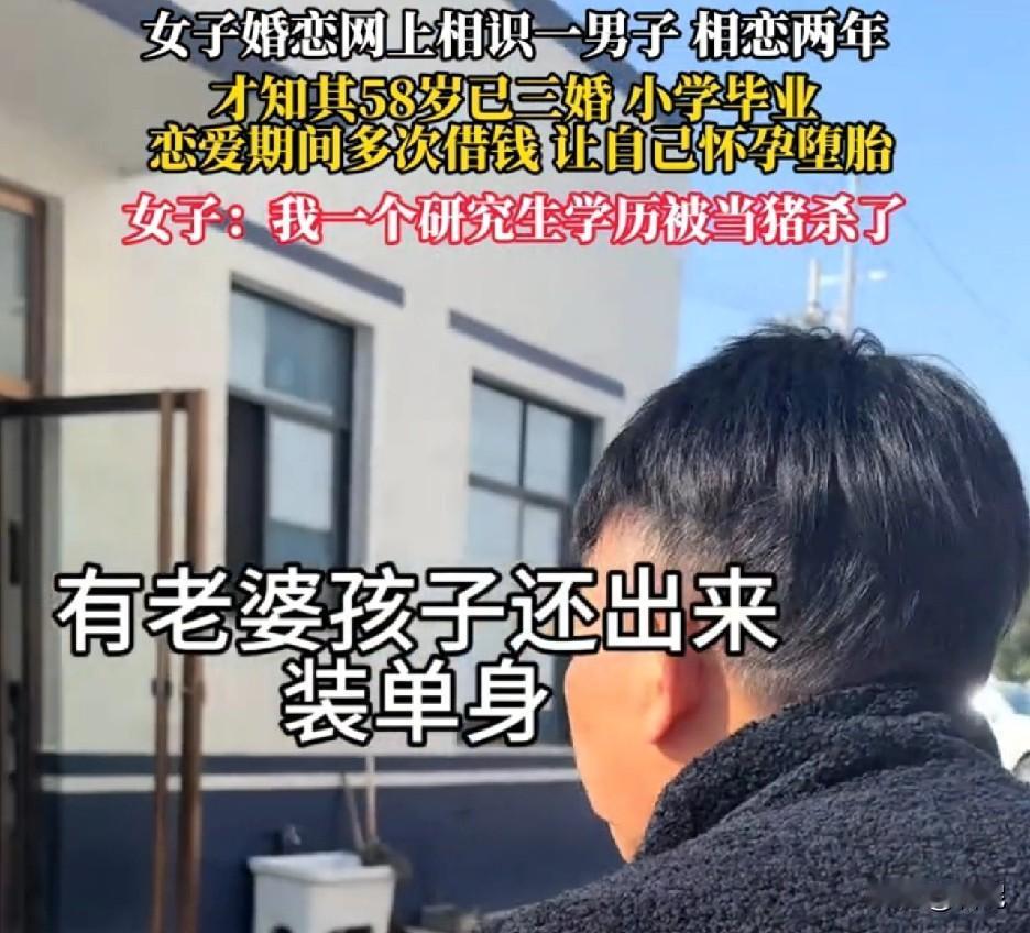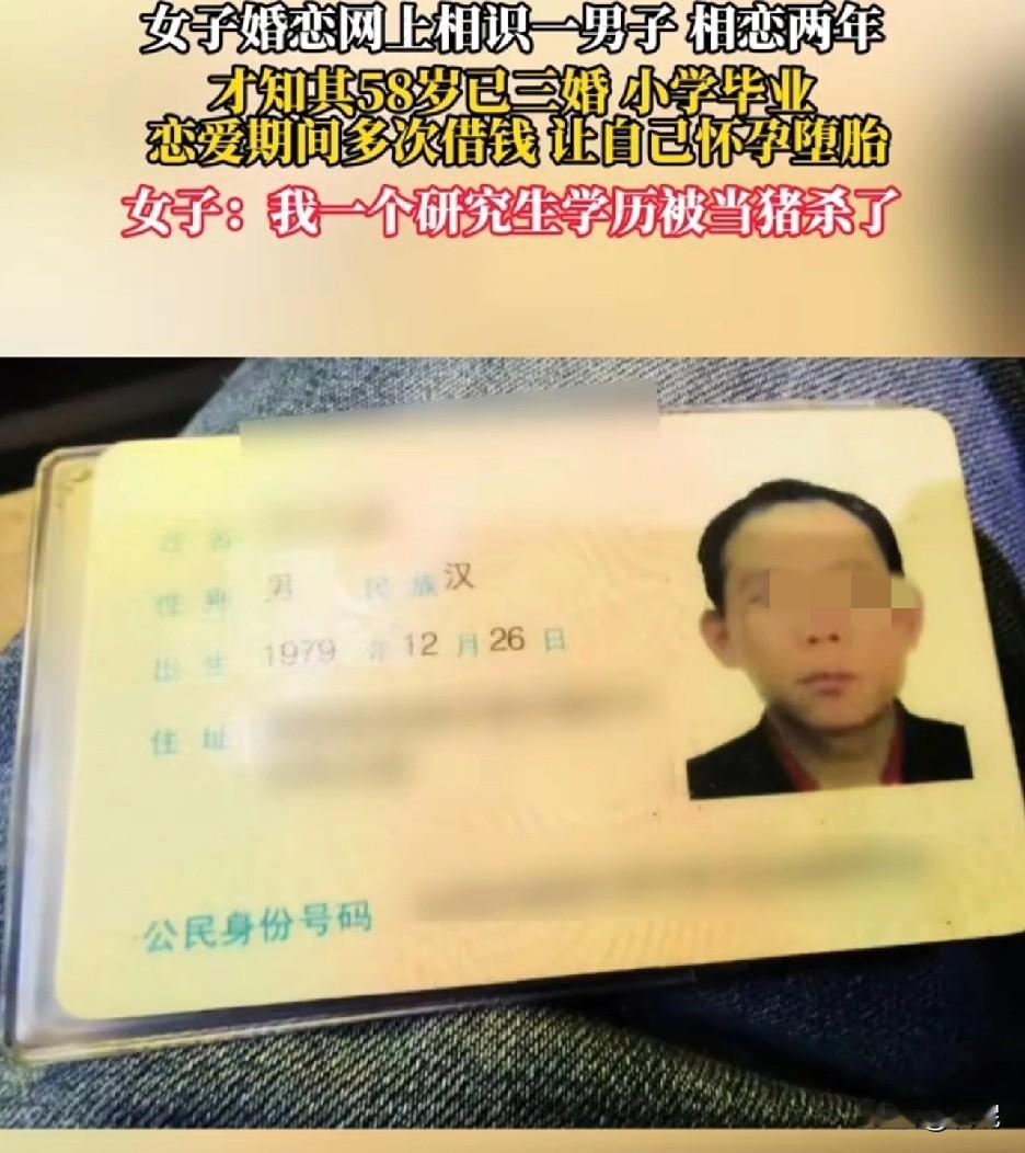 事实证明,学历跟情商没关系,高学历也可能是恋爱脑! 一女子研究生学历,婚恋网上相识一男子,相恋两年。女子才知道自己遭遇杀猪盘了,对方58岁,不仅有老婆孩子出来装单身,还是三婚,学历更是小学毕业。恋爱期间,多次男子向女子借钱,让女子怀孕堕胎。 这相貌,再看身份证上照片,我觉得头发都是假的,肯定是个秃顶的。老年味那么重,见一面都知道是老头了。还研究生学历,陪睡两年,还怀孕了,难道是读书读傻了? 最大可能性就是,这男子冒充富豪,然后说什么资金困难,然后让女子转钱。最后女子发现男子是穷光蛋,现在闹掰了,开始算账了。 妥妥恋爱脑啊,沉浸在自己世界的那种,幻想着单身富豪爱上研究生的她。 现在学校教的是理论知识,情商这块,现实这块很空白。加上父母的保护,孩子太单纯了。 希望女子能追回损失让男子受到惩罚,同时能吸取教训,别恋爱脑了被骗了。
