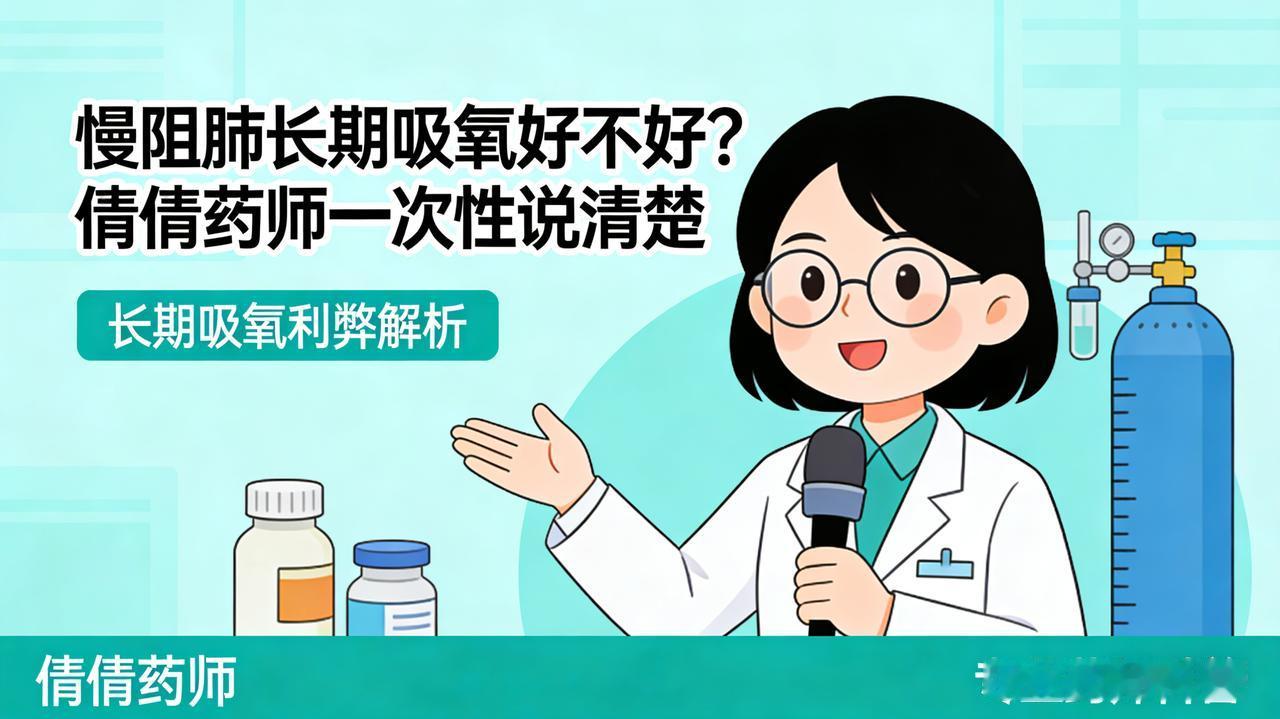 慢阻肺长期吸氧好不好? 慢阻肺长期吸氧好不好?倩倩药师一次性说清楚 很多慢阻肺朋友都纠结:天天吸氧会不会上瘾?会不会越吸越离不开? 今天用最通俗、最专业的话,给大家讲明白。 一、先给结论: 不是所有慢阻肺都要长期吸氧,只有“缺氧”的人,长期吸氧才是救命的! 它不是可有可无的保健,是医生规定的治疗手段,和吃药一样重要。 二、什么时候才需要长期吸氧? 简单记:血氧低、一动就喘、嘴唇/指甲发紫、晚上睡不好、白天没精神。 医学上标准是: - 静息状态下,血氧饱和度 ≤ 88% - 或动脉血氧分压 < 55mmHg 满足这个,长期家庭氧疗才对你真正有用。 三、长期吸氧到底有什么好处? 1. 不那么喘,走路更有力 缺氧一改善,胸闷、气短会明显减轻,日常活动轻松很多。 2. 保护心、脑、肺,少住院 长期缺氧会伤心脏、大脑、血管,坚持吸氧能减少急性加重、少进ICU。 3. 睡得香、精神好 很多人吸氧后夜间不憋醒,白天不犯困,生活质量明显提高。 4. 关键一点:能延长寿命 这是国内外研究公认的:符合指征的慢阻肺患者,坚持长期吸氧,能延长生存期。 四、大家最担心的 2 个问题 1. 吸氧会上瘾吗? ✅ 不会上瘾。 你不是“依赖氧气机”,是身体本来就缺氧,机器只是帮你补氧。 就像近视戴眼镜,不是眼镜上瘾,是眼睛需要。 2. 吸多了会不会氧中毒? ✅ 慢阻肺正规家庭氧疗,几乎不会氧中毒。 医生一般建议: - 流量 1~2 升/分钟 - 每天 ≥15小时 是低流量、长时间,很安全。 五、这 2 种情况,别乱吸氧 1. 血氧本来就正常,只是稍微咳嗽、有点喘——吸氧没用,白花钱。 2. 自己随便开高流量、长时间猛吸——反而可能抑制呼吸、加重二氧化碳潴留,很危险。 倩倩药师总结 - 慢阻肺缺氧的人,长期吸氧=救命、稳病情、少住院。 - 不缺氧的人,不需要长期吸氧。 - 一定要先测血氧、听医生的,按低流量、长时间规范用。 - 氧气不是保健品,是治疗药,用对才获益。