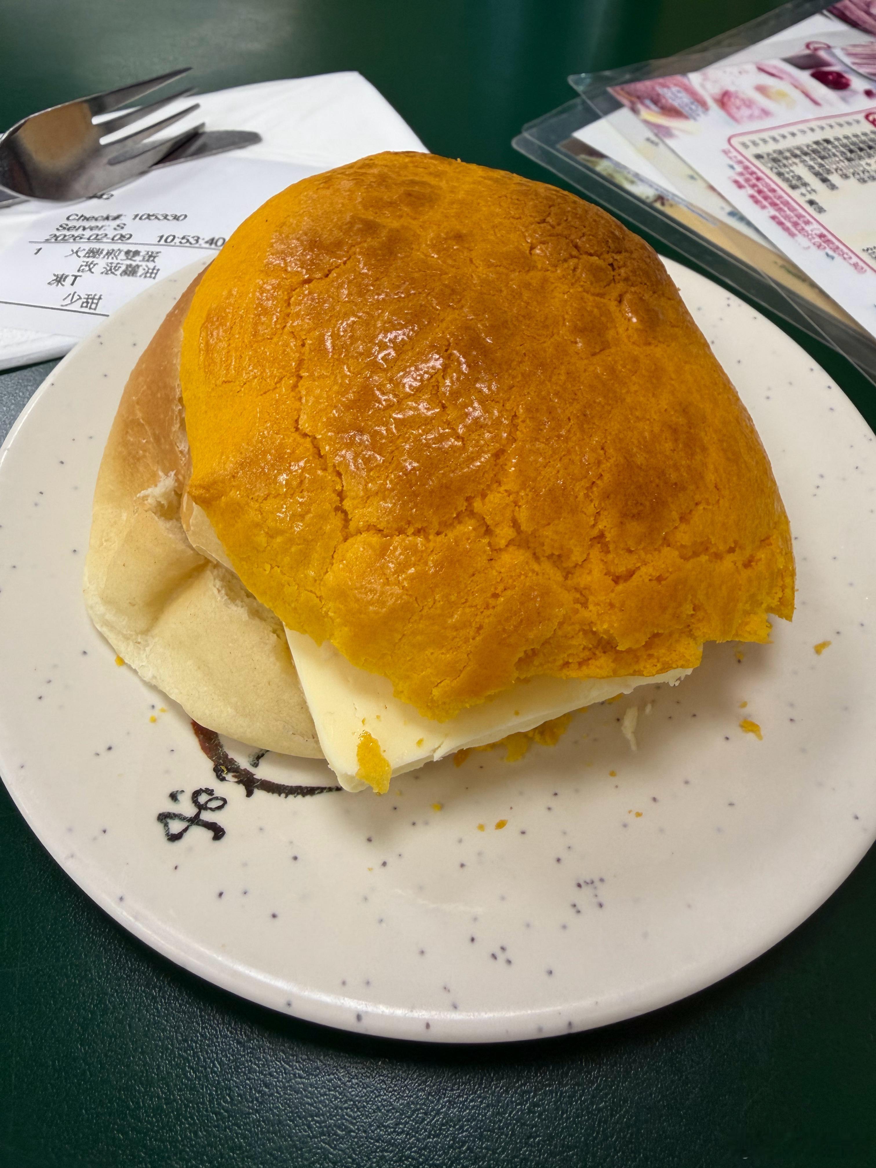 服务生:想食咩啊?我:A餐,煎双蛋加埋火腿啦,改菠萝油,唔该服务生:饮咩啊?我:冻奶茶少甜,唔该。