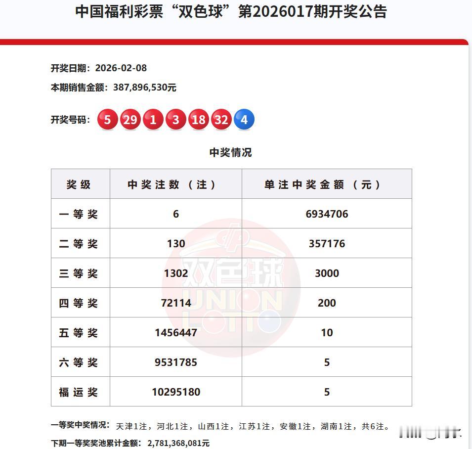 刚刚,我看到2026017期开奖的双色球一等奖中奖明细已经出来了。本期一等奖共中出6注,单注奖金693万,花落六省市 ,而本期的二等奖也开出130注,单注奖金35.71万,从这一期的开奖结果和浮动奖奖金分配上来说,浮动奖的中奖者还是比较开心的,不像上一期的开奖结果,浮动奖奖金都下跌得比较厉害,尤其是二等奖只有8.9万。 新规之后,双色球增加了“福运奖”,也就是中三个红球就有五块钱的奖金,最近几期每期都爆奖800万注以上,最高就是上一期中出1167万注,因为当期销售量里的奖金优先派发固定奖,所以,浮动奖的奖金浮动就比较大。 现在很多人对于福运奖也有不同的看法,福运奖每期的中奖注数比六等奖还要高,因为只需要三个红球就可以中奖,伴随着福运奖的爆奖,一二等奖等浮动奖受到的影响非常大,虽然中五块钱变得容易了,整体的中奖概率大幅度提升了,但一旦中了二等奖,有可能只有几万块钱的奖金,扣完20%的个人所得税以后到手的奖金少得可怜,而能中二等奖对于很多人来说一辈子可能只有一次。 所以,小奖的增加也是让人又爱又恨,既希望中一二等奖,同时也不希望小奖爆奖太多。因为没有几个人买彩票是冲着五块钱奖金去的。不中大奖的时候中点小奖当然也是一种安慰。 鸿水说