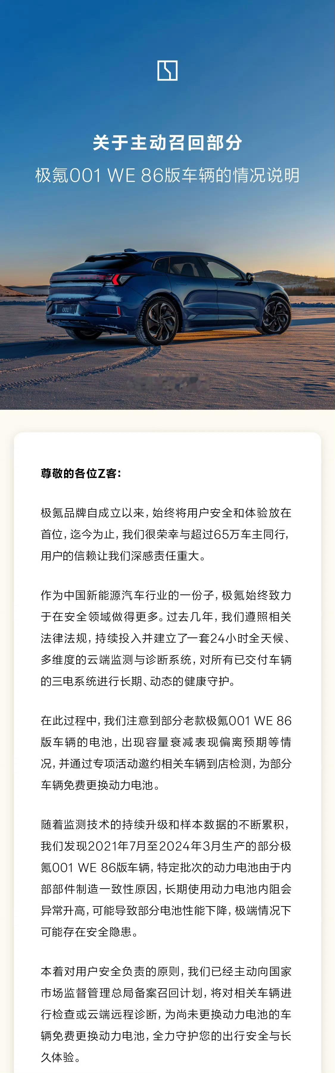 这批车主要是2021年7月至2024年3月生产的极氪001 WE 86版,问题源于部分批次电池存在使用隐患。品牌会为涉事车辆免费更换电池,此前已经更换过的车辆不用再次处理。