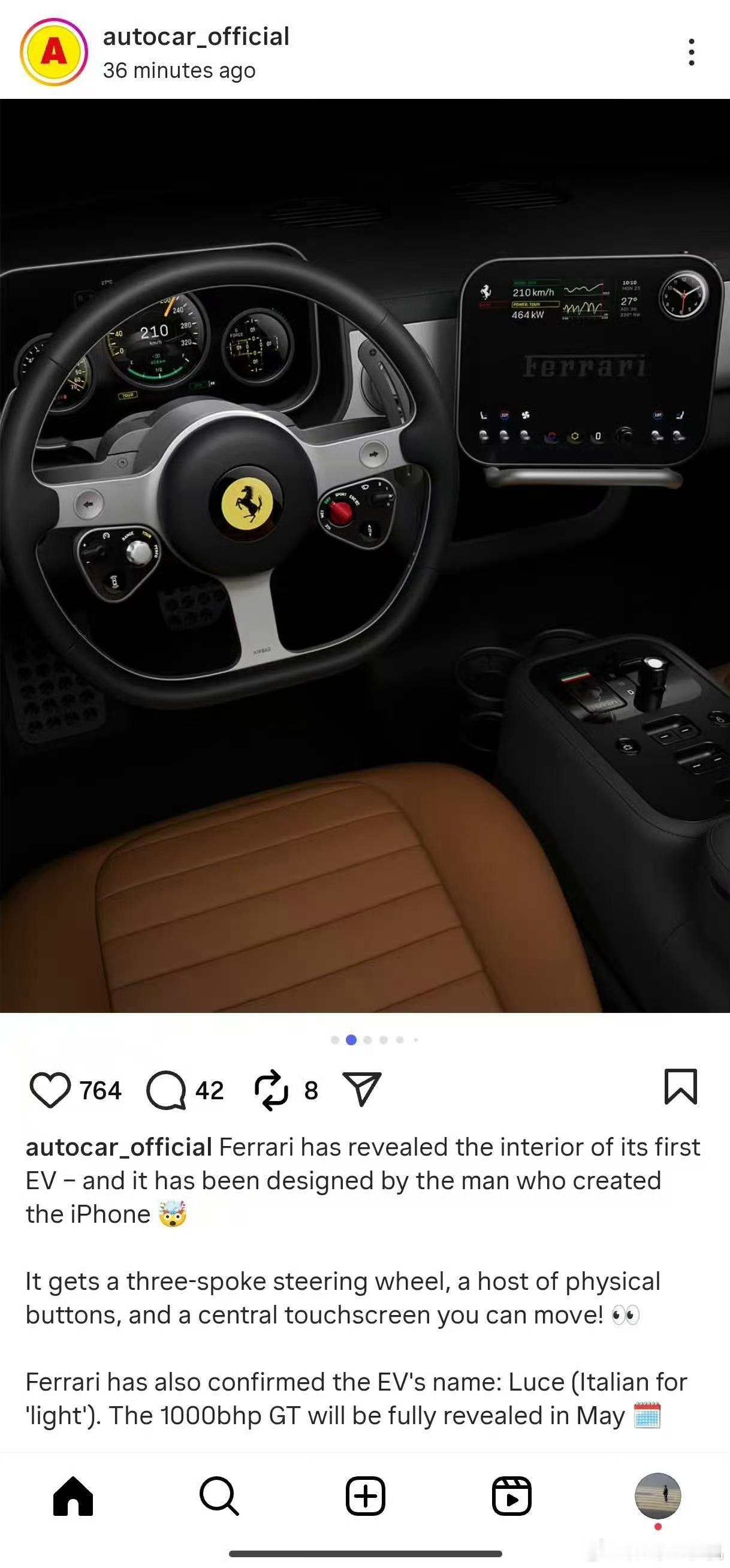 法拉利首款纯电车型内饰曝光法拉利首款纯电车型内饰曝光来了,Ferrari电动超跑正式命名——LUCE。抛开其他不说,大量的实体按键设计,这设计怎么这么苹果,每一个细节都好像有iPhone,iPad,Mac的影子,不愧是苹果设计师操刀
