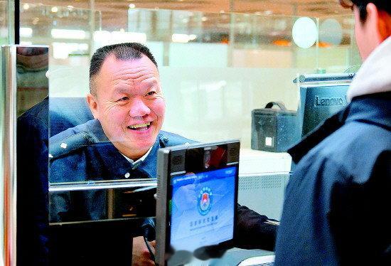 图为北京边检总站执勤三大队执勤三队民警李岳云正在为旅客办理出境手续。