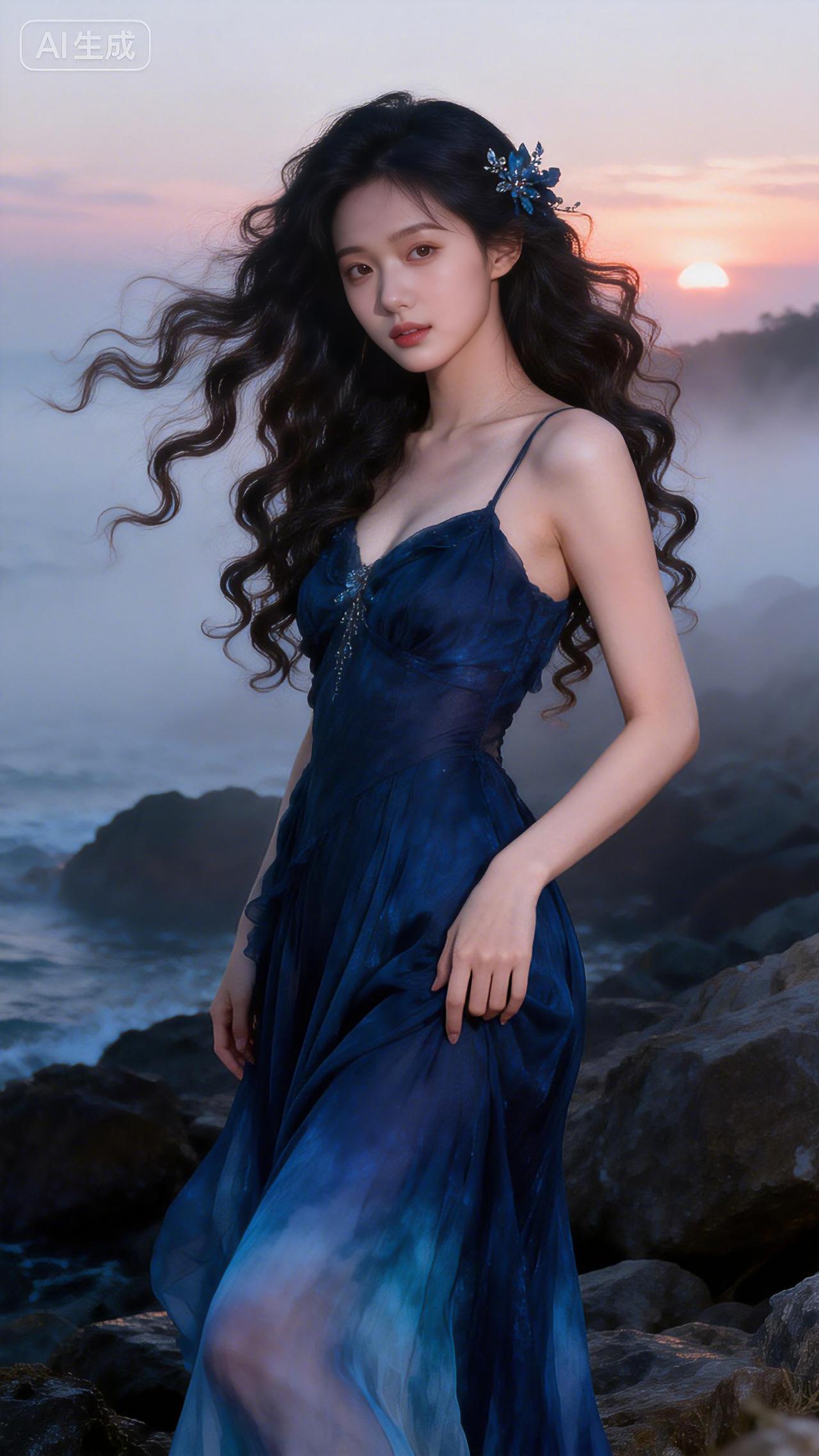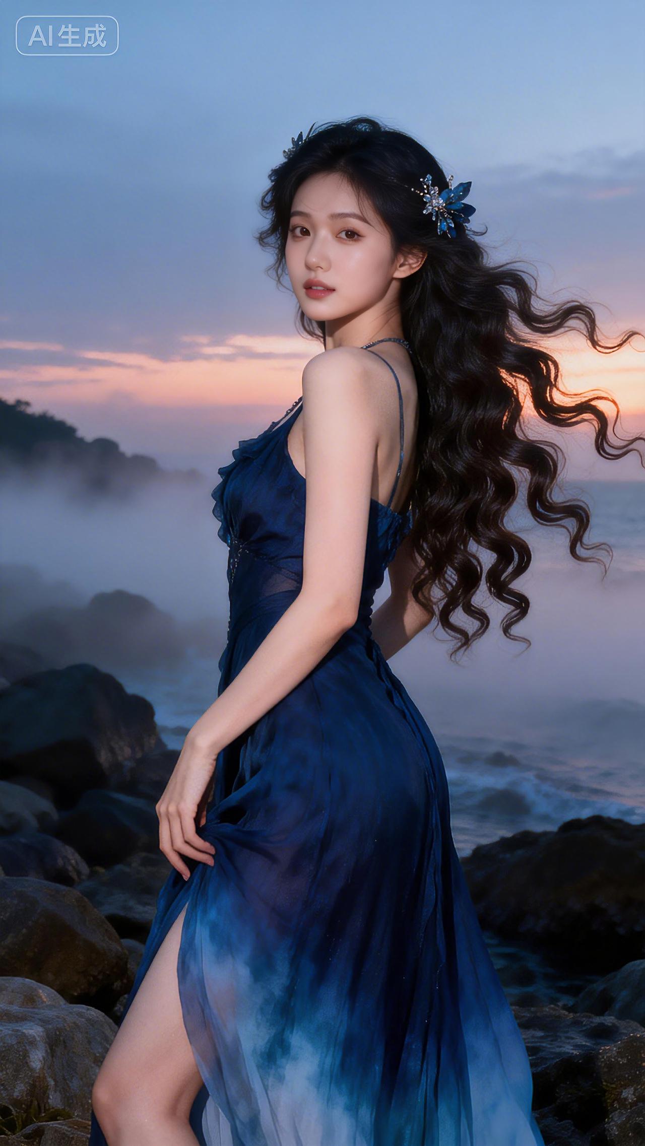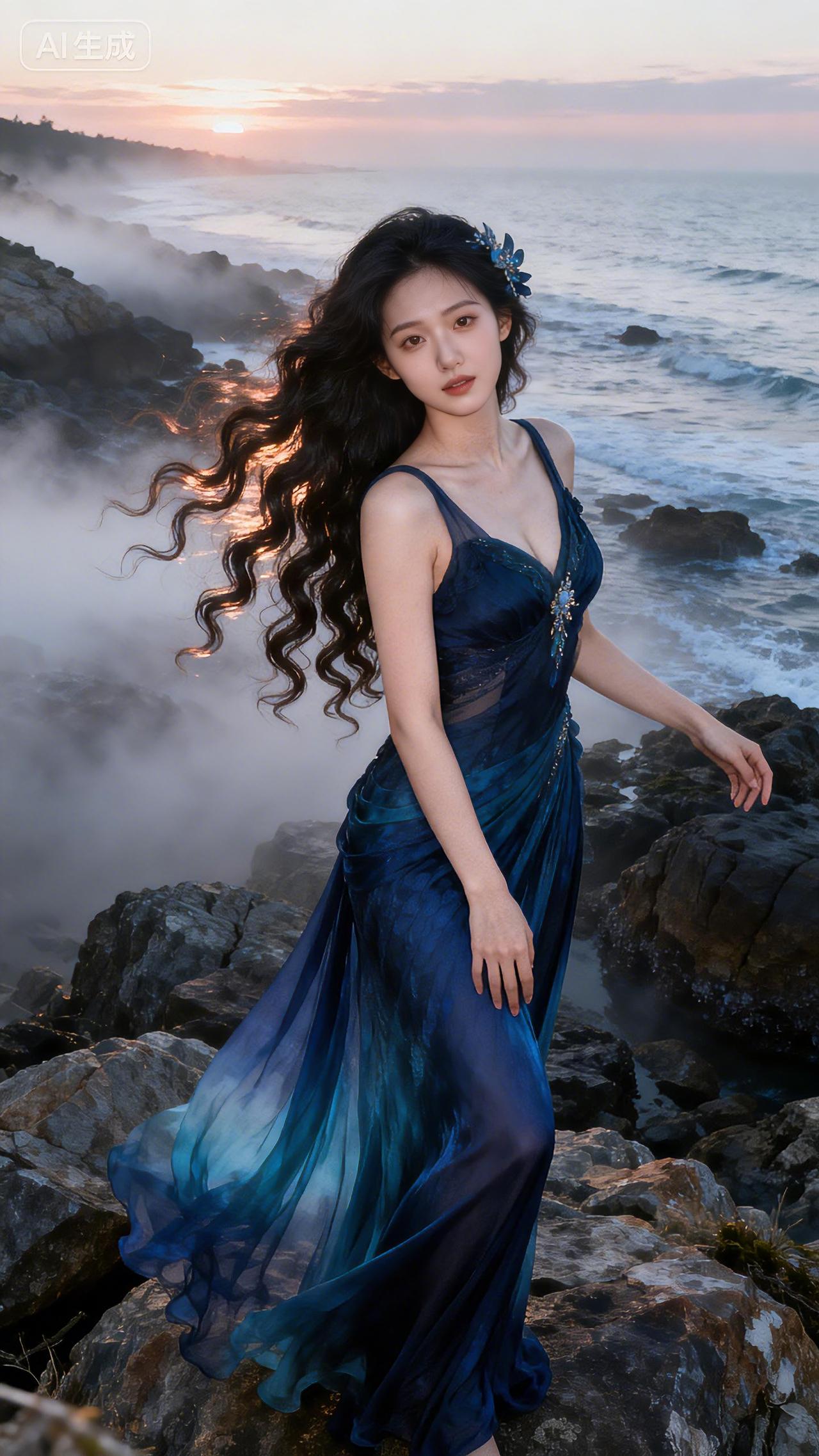 美图壁纸共享暮海蓝裙,薄雾礁石,勾勒静谧诗篇。豆包 壁纸 写真