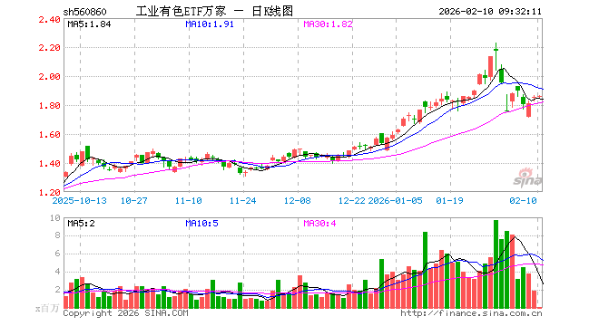 2月10日,工业有色ETF万家(560860)开盘涨0.05%,报1.855元。工业有色ETF万家(560860)重仓股方面,洛阳钼业开盘涨0.31%,北方稀土跌0.04%,中国铝业涨0.54%,云铝股份涨0.22%,江西铜业涨0.23%,兴业银锡跌0.26%,铜陵有色涨0.14%,西部矿业涨0.47%,厦门钨业涨1.14%,天山铝业涨0.78%。