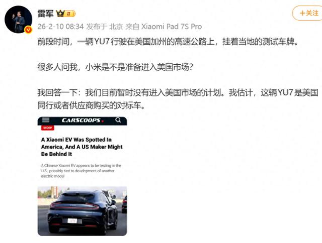 前段时间,一辆YU7行驶在美国加州的高速公路上,挂着当地的测试车牌。2月10日,小米集团董事长兼CEO雷军发文回应称,小米目前暂时没有进入美国市场的计划。他估计这辆YU7是美国同行或者供应商购买的对标车。