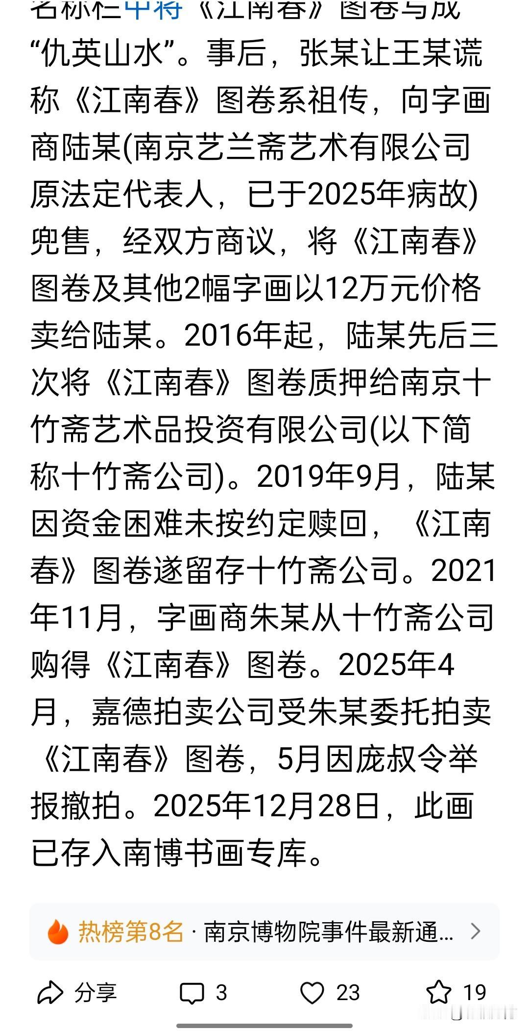 南京博物院藏品流出事件有了官方调查结果,有人说是大快人心,也有人说是避重就轻。在没有其他相抵触的信息的情况下,我还是选择相信官方结论。 官方消息说《江南春》已经存入南博专库,我好奇的是画卷最后一次流转是商人朱某从十竹斋购得,如果是正当交易,那么现在流回南博算是追回,赎回,还是购入?[大笑]