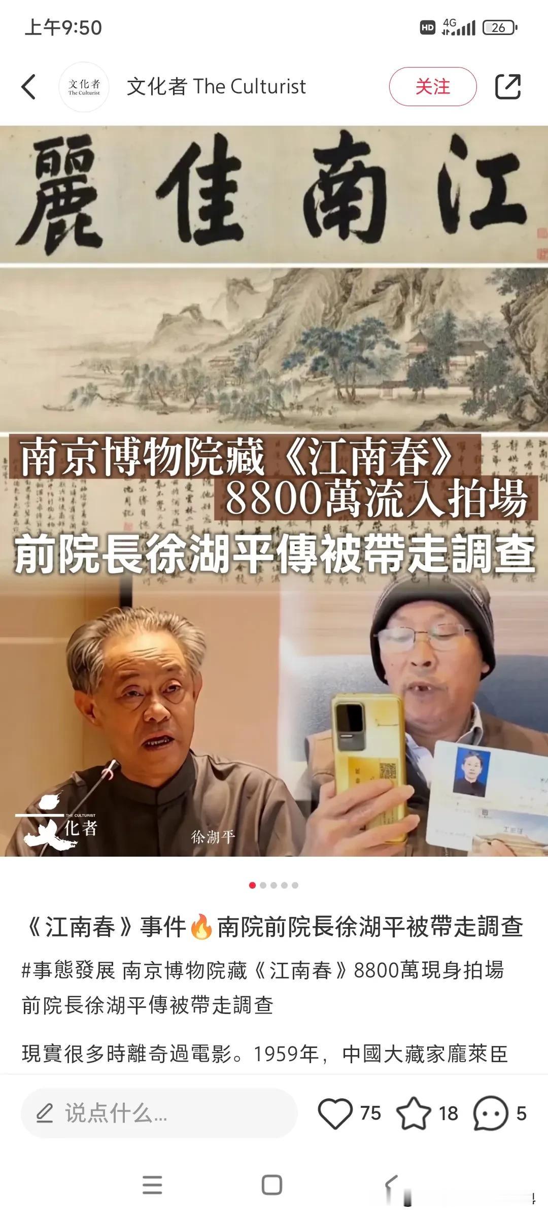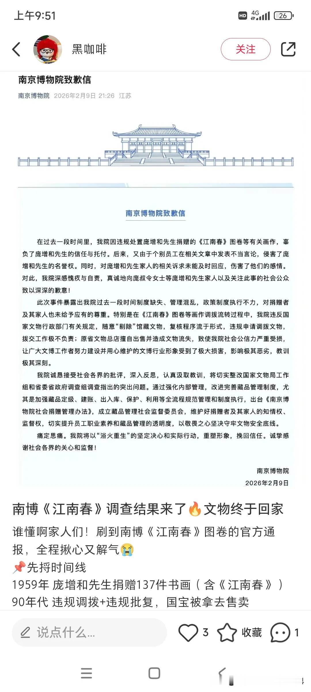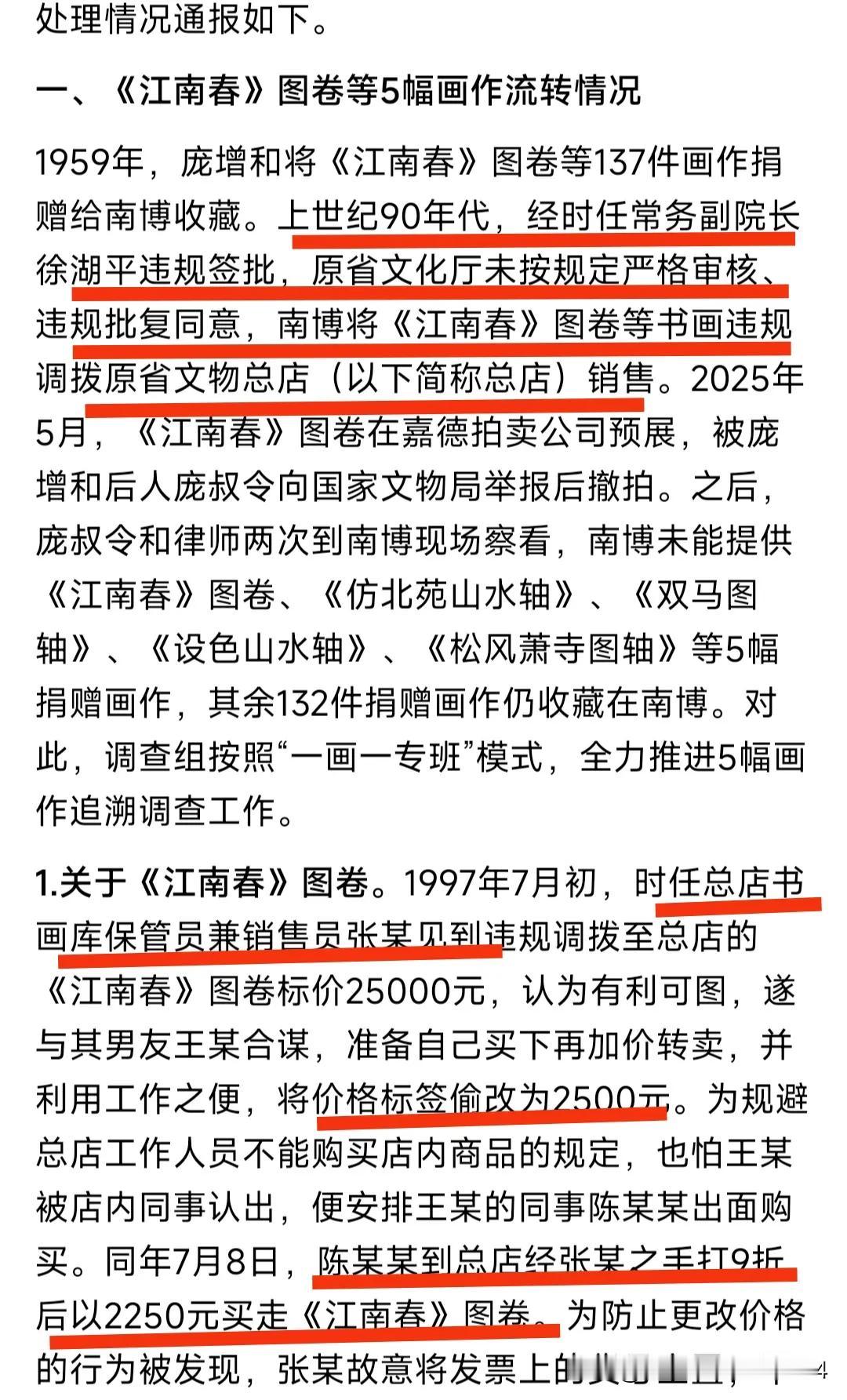 南博院事件调查有了结果,通过豆包捋下庞家与之纠纷的时间线,震惊了: 1959年,庞增和(庞莱臣长孙)向南博无偿捐赠古画137件。 1963年,南博以办展为由,向庞增和借走2件古画不还。 1961年-1964年,南博经专家鉴定,将5件画定为“伪作” 此后,便是庞家与南博之间长达数十年的纠纷: 1979年-1988年,庞增和多次向南博讨要借出的2件古画,无果后起诉,南博按征购处理,支付了5.4万元。 2014年,南博举办庞莱臣纪念展,策展人庞鸥(与庞家无任何血缘关系,只是同姓)文章称庞家“败落到卖画为生”,引发庞家不满。 2015年,庞家后人起诉南博及庞鸥侵犯名誉权,南博道歉。 2016年-2023年,庞家持续追问画作流失问题,期间有南博职工举报徐湖平涉嫌不当处置文物。 2024年10月,庞叔令致函南博要求查137件捐赠藏品,遭无视后起诉。 后面的事,就是从25年5月,仇英《江南春》流入拍卖预展,大家也都知道了。让我震惊的是, 庞家作为名门望族,长达数十年关注捐赠古画,在其后人都在的情况下,南博前院长徐湖平还敢暗箱操作,将那5件“伪作”划拨出去,流入市场,从中得利。 而《江南春》最后低价被转卖私人,竟然是一个南博普通员工干的。可见当时南博这规章程序是有多少筛子眼啊! 看了南博后续的整改,成立监督委员会,出台《社会捐赠管理办法》,规范全流程, 还算详尽严谨。希望以后在此制度下,人能少点贪心,多点敬畏,南博能守好宝贝,警醒他人。 莫再让宝贝流失了,这是咱文化财产的根!