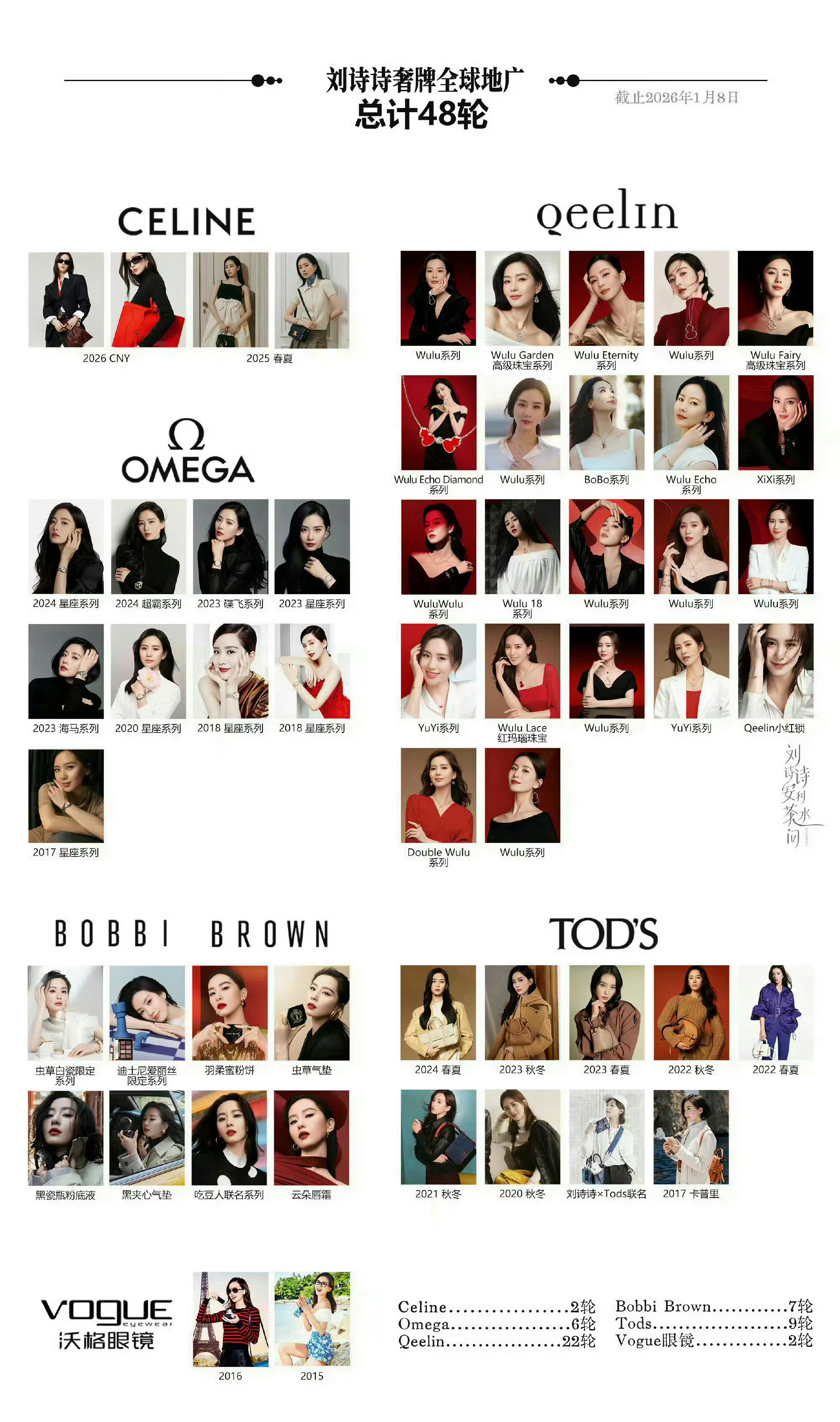 刘诗诗从不缺奢代,4奢女王多年,也是最早有奢代和全球地广最多的85花,现在一姐工