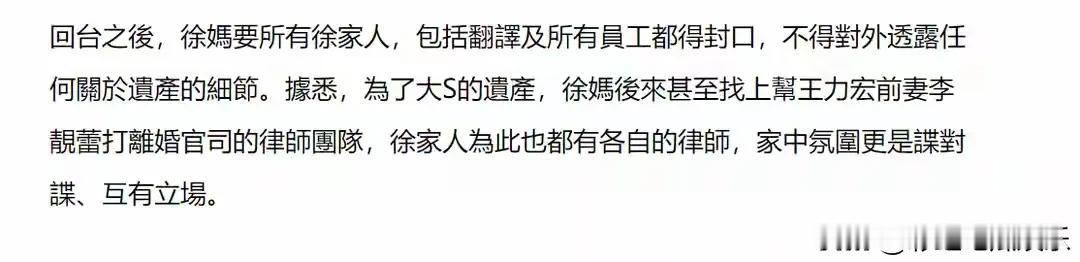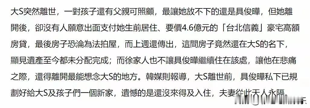 S妈严防死守大S财产不让具俊晔分走?都说了没有永远的朋友,只有永远的利益。 本以为S妈真的把具俊晔当儿子看待,那都是表面上的,大S离世人走茶凉,具俊晔也是工具人。 不过S妈和小S否认花重金聘请李靓蕾律师,具俊晔本身也没有争财产,S妈没必要告他,但是肯定会告前女婿,实在太现实了。