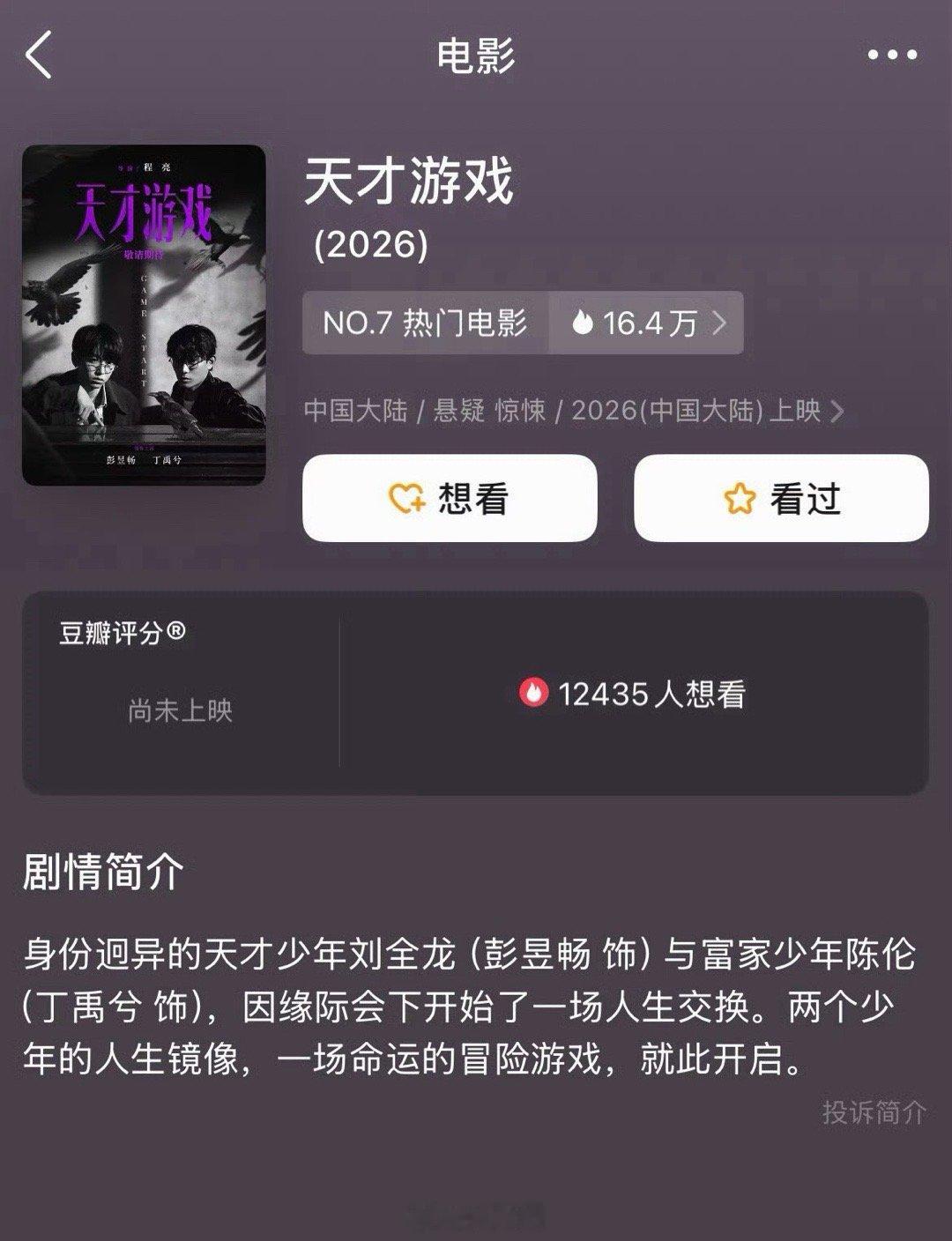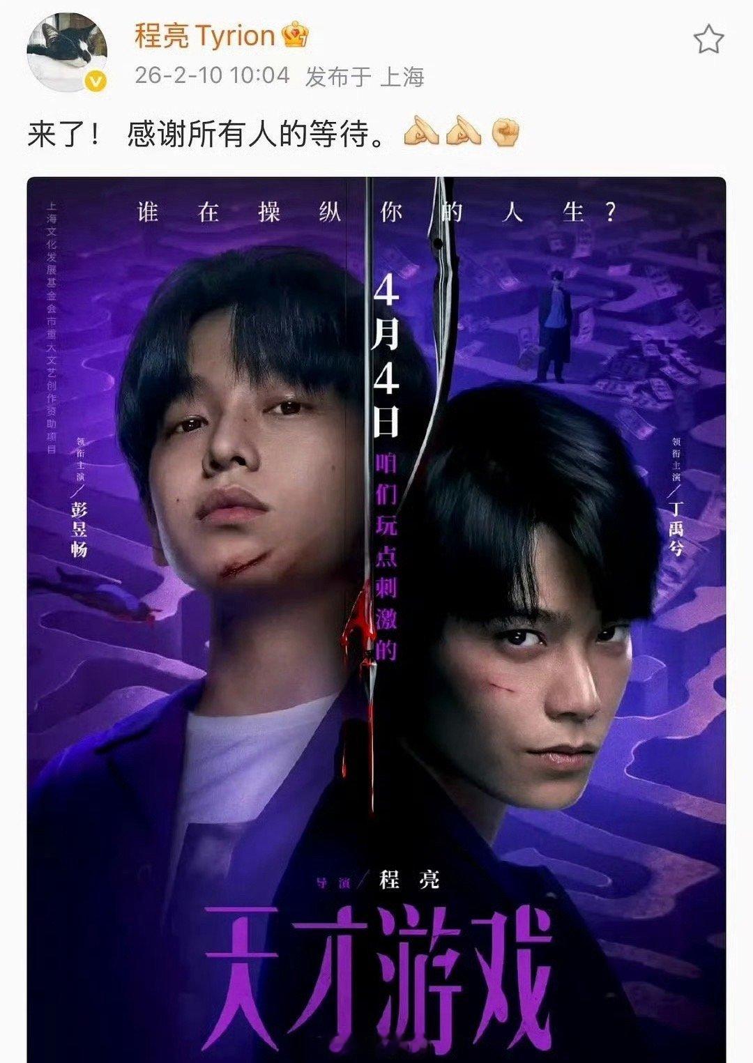 丁禹兮彭昱畅双人海报 丁禹兮、彭昱畅主演的电影《天才游戏》终于要来了,这部剧从2021年就说要定档,这次终于不是狼来了啊,丁禹兮拍这部电影的时候才25岁,两位的演技不相上下,天才少年和富家少年的battle,有点意思~丁禹兮彭昱畅新片定档海报