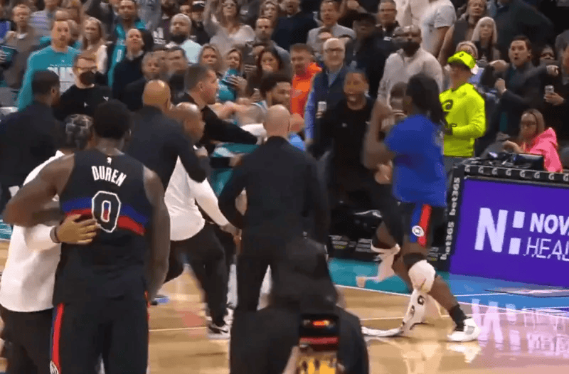 比赛的第三节,活塞黄蜂爆发大规模冲突,斯图尔特从替补席冲进场地追打布里奇斯引发第二轮冲突。