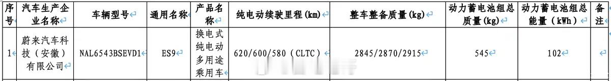 蔚来ES9的电池数据曝光了,搭载的是102kWh电池,纯电续航分别为580km、600km和620km