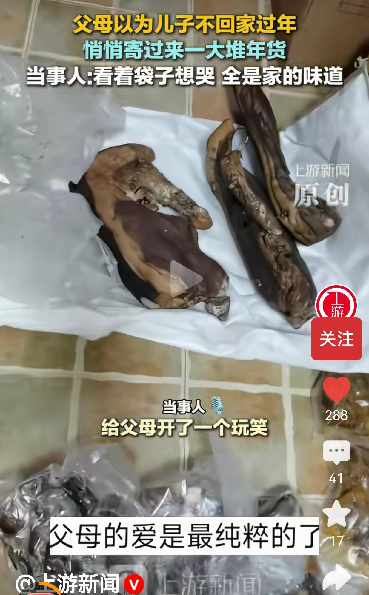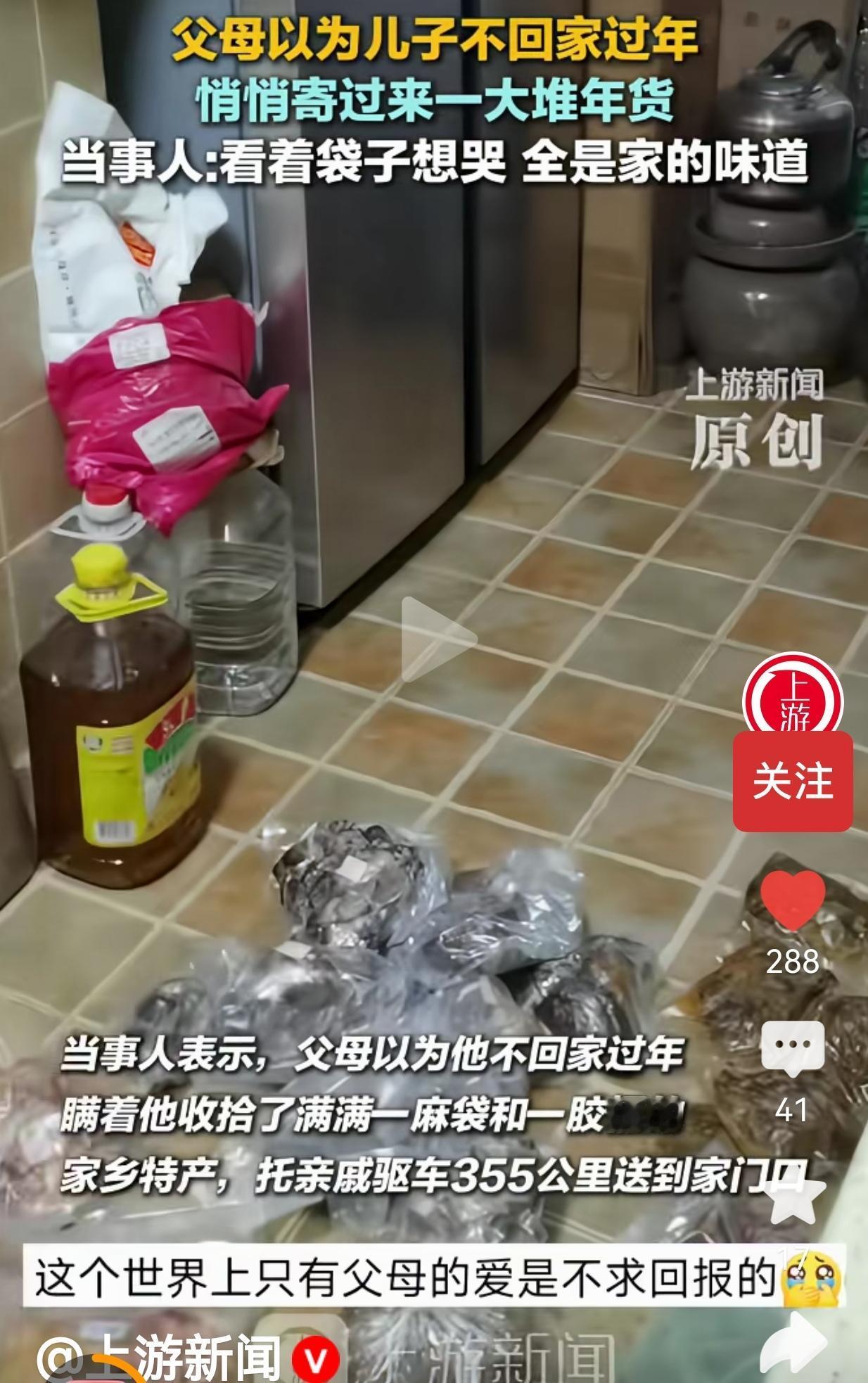 看哭了!在重庆工作的一个小伙子,本来打算回家过年,为了给父母一个惊喜,他故意跟爸妈开了个玩笑,说“今年可能回不去了。结果父母却当真了,以为儿子工作太忙,回不了家了! 父母想着儿子吃不到自己做的菜了,特意托老家的亲戚,从贵州老家驱车355公里,给儿子送来老年的年货。 就这样,没过几天,他收到了两大袋东西。 等到小伙打开包裹的那一刻,直接看哭了。 小伙子把父母送来的年货整整齐齐地摆在厨房里,厨房的地上都快摆不下了。 里面有豌豆尖:这是妈在菜园里掐的,那是他每年回家必吃的一口鲜。还有处理得干干净净的土鸡和黄牛肉,这是他爸爸托人从乡下收的,每一包肉上都仔细贴了手写的标签,写着“红烧”“炖汤”,怕他分不清做法。还有腊肉,甚至连菜籽油都准备好了。 这里的每一样东西,都是他从小吃到大的味道。 他说:“看着袋子就想哭,全是家的味道。” 此事引发无数网友的共鸣,有的网友说:“看到豌豆尖我直接泪目,我妈每年都给我寄,说外面的没家里的香。” 还有的网友说:“我再也不敢跟我爸妈说不回家了,因为,他们的爱太重了,我怕我接不住。” 谁能想到,小伙子只是随口一说“不回家了”,爸妈却当了真。他们没说一句抱怨的话,只是默默收拾了满满一麻袋、一胶桶的东西,托人千里迢迢送过去。 他们的逻辑很简单:儿子回不来,那我们就把“年货”给他送过去。 他在外面吃不到家里的味道,那我们就把家里的味道给他寄过去。 这就是父母对儿女无私奉献的爱。 通过这事,也希望所有在外漂泊的游子,没有事情了,一定要多回家看看父母,陪他们说说话,唠唠嗑。总总说有空了就回家,你要知道,父母的时间,在一天天变少。 他们年纪大了,真的经不起等待。 大家觉得呢?欢迎大家评论区讨论留言。