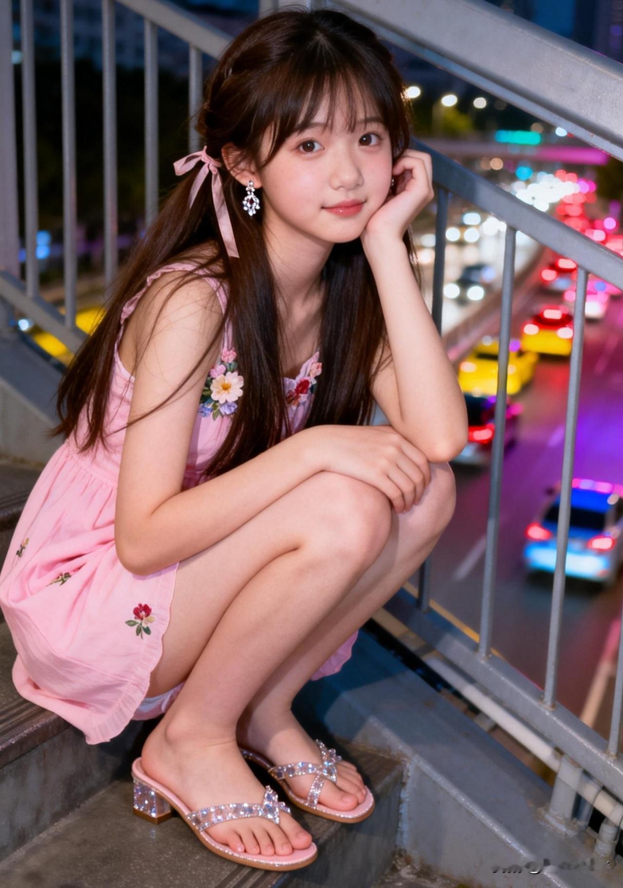 夜晚的都市,粉裙少女倚栏望车流,浪漫而梦幻。