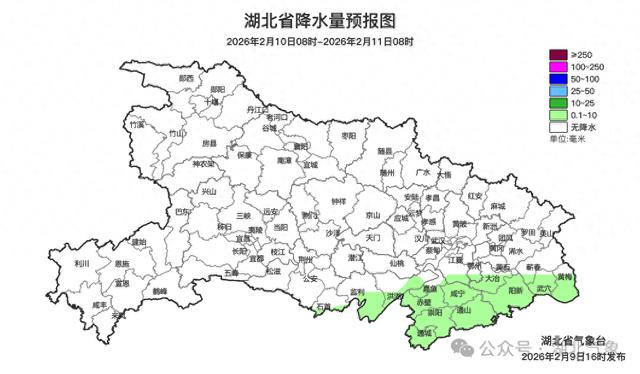 2月10日08时-11日08时,江汉平原南部、鄂东南短时小雨转多云;其他地区多云到晴天。早晨省内局地有雾。最高气温西部16~19℃、中东部12~16℃,最低气温北部-3~1℃、南部1~4℃,偏南风转偏北风2到3级、阵风4到6级。