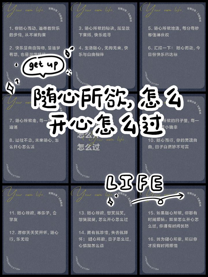 想要生活得开心快乐,可以从以下几个方面入手: 1. 保持积极心态 学会感恩,关注生活中的美好事物。 用积极的眼光看待困难和挑战,把它们视为成长的机会。 2. 照顾好自己 保持良好的生活习惯:规律作息、均衡饮食、适度运动。 给自己一些放松和休息的时间,避免过度压力。 3. 建立良好的人际关系 与家人、朋友保持联系,分享快乐和困难。 -学会倾听和理解他人,建立真诚的关系。 4. 追求兴趣和爱好 投入到自己喜欢的事情中,比如阅读、旅行、音乐、绘画等。 爱好可以带来满足感和成就感。 5. 设定合理的目标 给自己设定一些可实现的小目标,逐步实现,增强自信。 不要过于苛求完美,接受自己的不完美。 6. 学会放下和接受 接受生活中的不完美和不可控因素,减少焦虑。 学会原谅自己和他人,减少心中的负担。 7. 关注当下 活在当下,享受每一刻的美好,不为过去的遗憾或未来的担忧所困扰。 练习正念冥想,有助于提升心境平和。 8. 帮助他人 给予和帮助别人,能带来内心的满足和快乐。 参与志愿服务或社区活动,感受到归属感。 总结: 快乐的生活来自于内心的满足和对生活的热爱。保持积极、善待自己和他人、追求自己喜欢的事物,逐步建立起属于自己的幸福感。每个人的快乐之道都不同,找到适合自己的节奏和方式最重要。