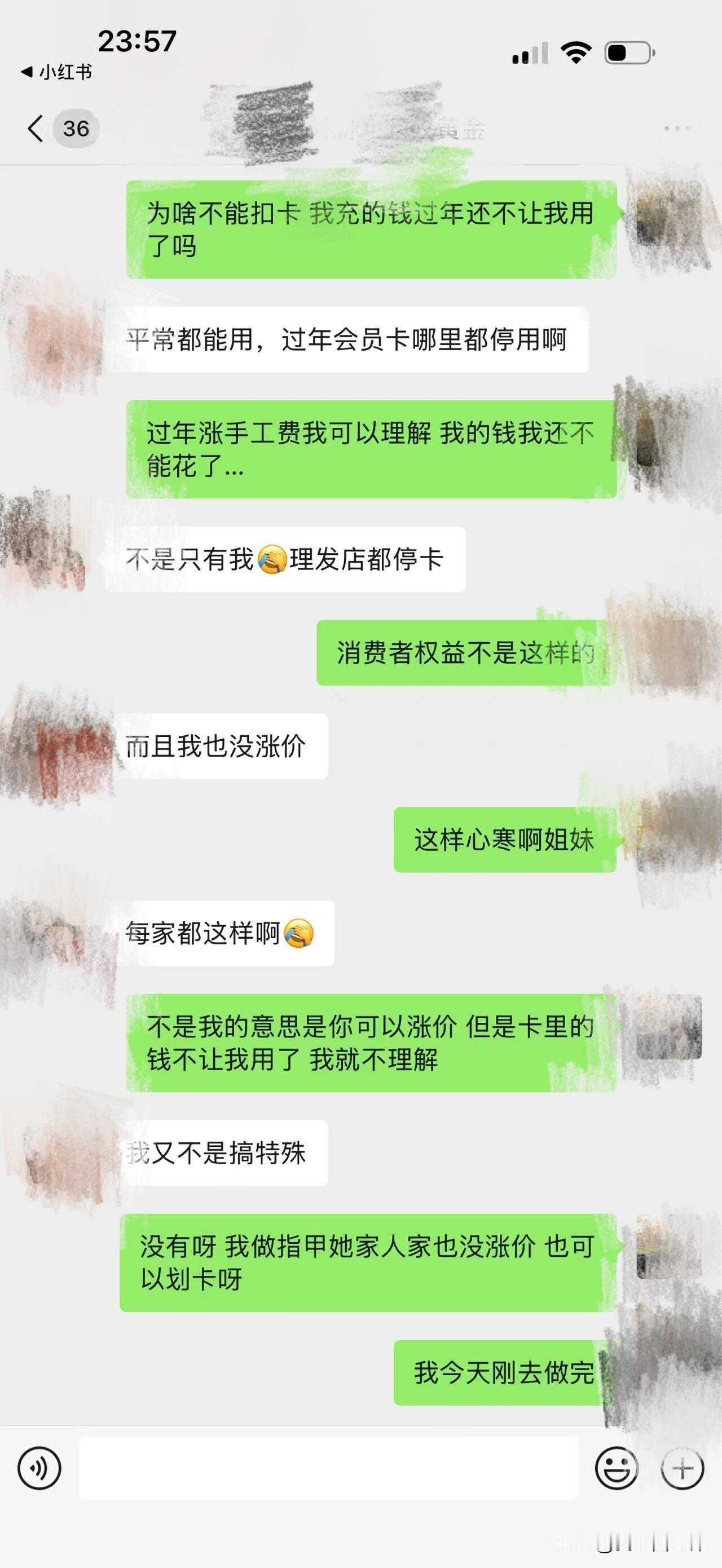 我的天呐!充值卡的钱过年就不是我的钱了吗 我实在是百思不得其解,蹲一下懂法的姐妹普及一下,这已经不是钱不钱的问题了,实在太难以理解了,凭什么啊? 事情是这样的,侄女在一家美睫店充了卡,但是已经不怎么用了,想着快过年了刚好我要接睫毛,就给我拿去用好了,结果问了下人家说过年不给扣卡,说每家店都是这样,我特地去翻看了我每次接睫毛的店,一看人家也通知2号开始不扣卡了,真的是离了个大谱,过年你说涨个20块30块手工费都能理解,毕竟人家做生意的确实有淡旺季,你涨个二三十手工费,那完全看个人,人家不接受的就不强求,不做也行,但是会员卡的钱是人家实打实充进去的钱,凭什么不让用,也没有赠送啊,就是纯充值享折扣而已,充进去的钱过年了就不是钱了,得另掏腰包,那人家为啥要充值,充值了还充成了俄罗斯套娃给你套住了。我真的是不能理解,每个充值完的姐妹过年不让扣卡都心服口服没有意见吗,这种霸王条款真的没有问题吗?店家还理直气壮地说每一家都这样,我真的被震惊到了,还是说贫穷让我没有这种充值的习惯,不了解充值的市场的规则?有没有姐妹来说说,大家真的充值完都愿意让店家这么搞都没意见吗?