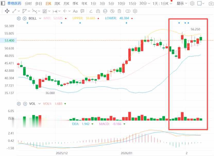 但之后,泰格医药股价又迎来近半个月的技术性下跌,于1月28日跌破50港元。此时公司股价在技术面上已触及BOLL线中轨,并有继续下探至下轨位的趋势。不过这一趋势被其在1月29日和30日的两日大涨打断,还将公司股价走势硬生生“掰回”到企稳回升的形态中。而导致这一盘面变化的根本原因或在于泰格医药披露的2025年年报业绩预告。