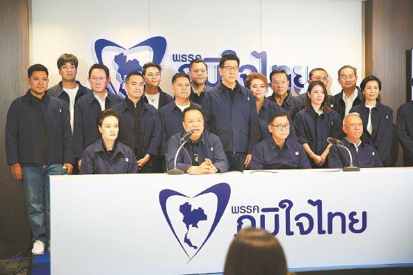 自豪泰党党首阿努廷(前排中)胜选后出席发布会新华社发