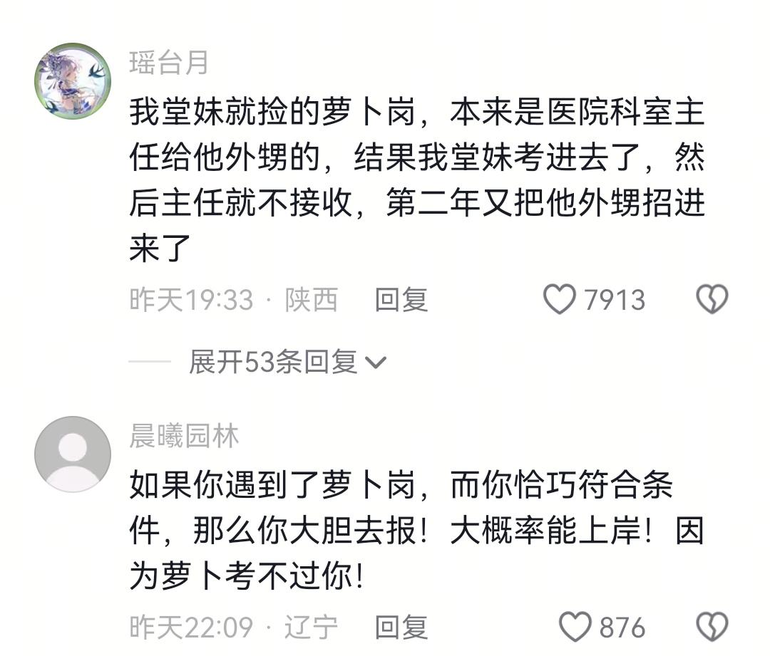 什么是萝卜岗? (如图所示)有不少网友反应,在好单位的公开招聘中发现萝卜岗,是指为特定内定人员量身定制的岗位,因“一个萝卜一个坑”得名。招聘单位会设置针对性极强、常人难以满足的条件,看似公开招聘,实则提前内定人选。这种行为排除了其他竞争者,破坏招聘公平,常见于事业单位、国企等招聘中,属于违规用人现象,违背了公平公正的原则。