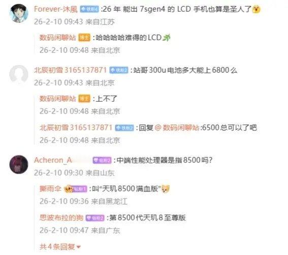 有网友感叹:“26 年能出 7sgen4 的 LCD 手机也算是圣人。”博主回复称:“哈哈哈哈难得的 LCD。”还有网友询问 vivo X300 Ultra 手机能否配备 6800mAh 电池,博主则表示:“上不了。”