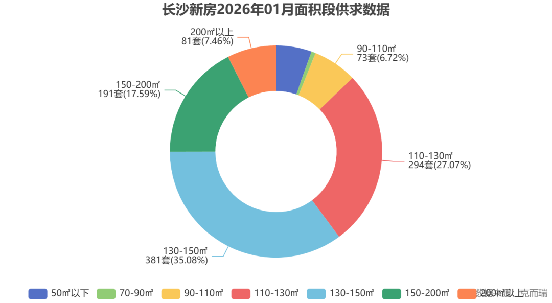 为什么主城新盘能持续热销?核心在于购房逻辑的根本性转变。克而瑞数据显示,2026年1月长沙楼市建面130-150㎡户型成交占比41.6%,建面110-130㎡占比27.1%,合计超六成。