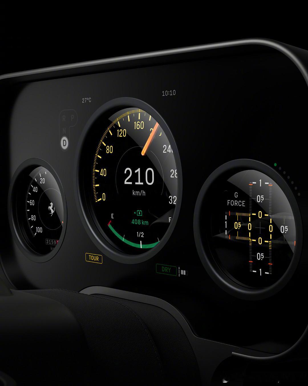看得出法拉利是想将复古感融入到内饰设计之中。就比如方向盘,指针仪表,有棱角感的仪表,座椅的设计。而在实用性上谢天谢地法拉利并没有因为Luce是电动车就随大溜儿。