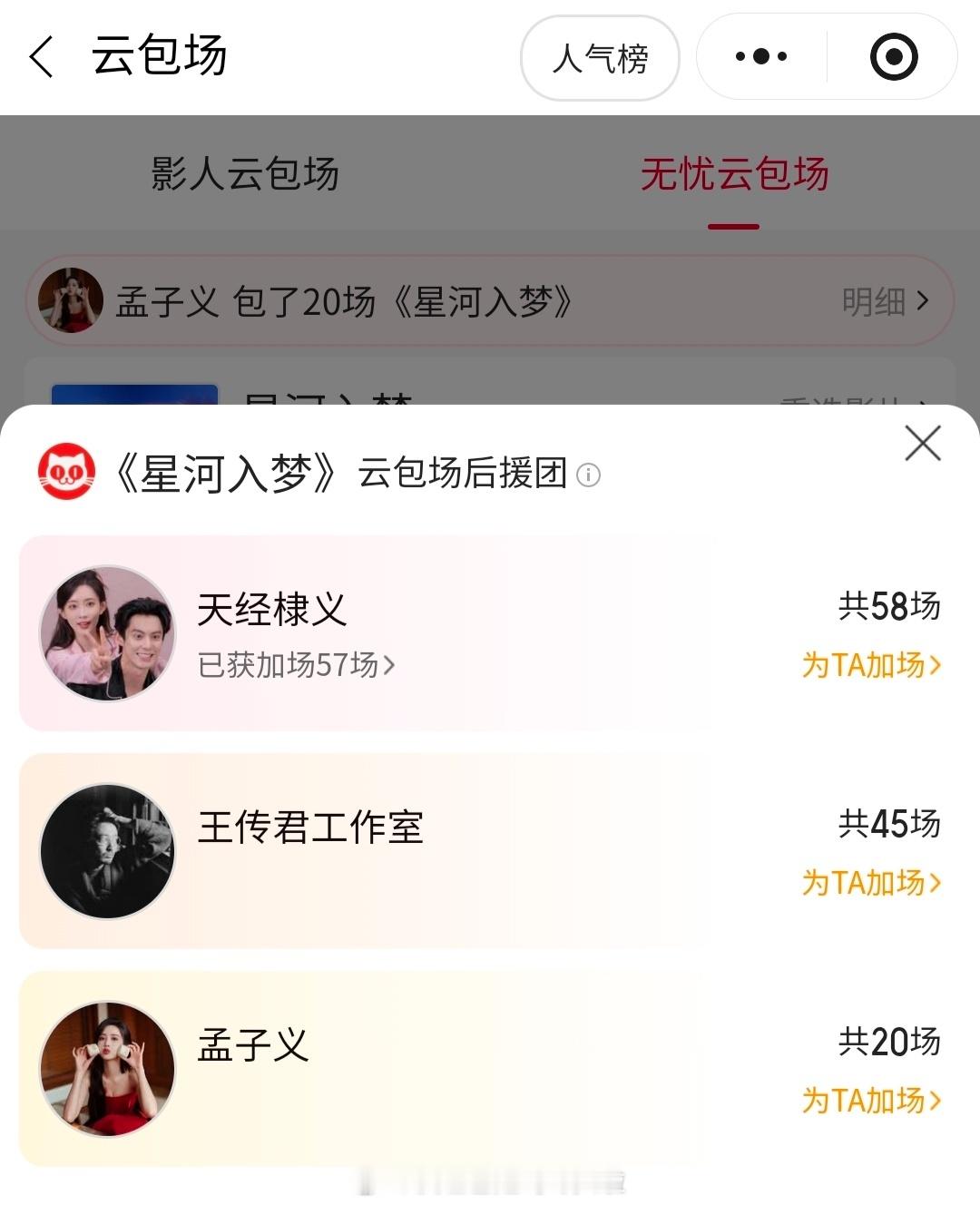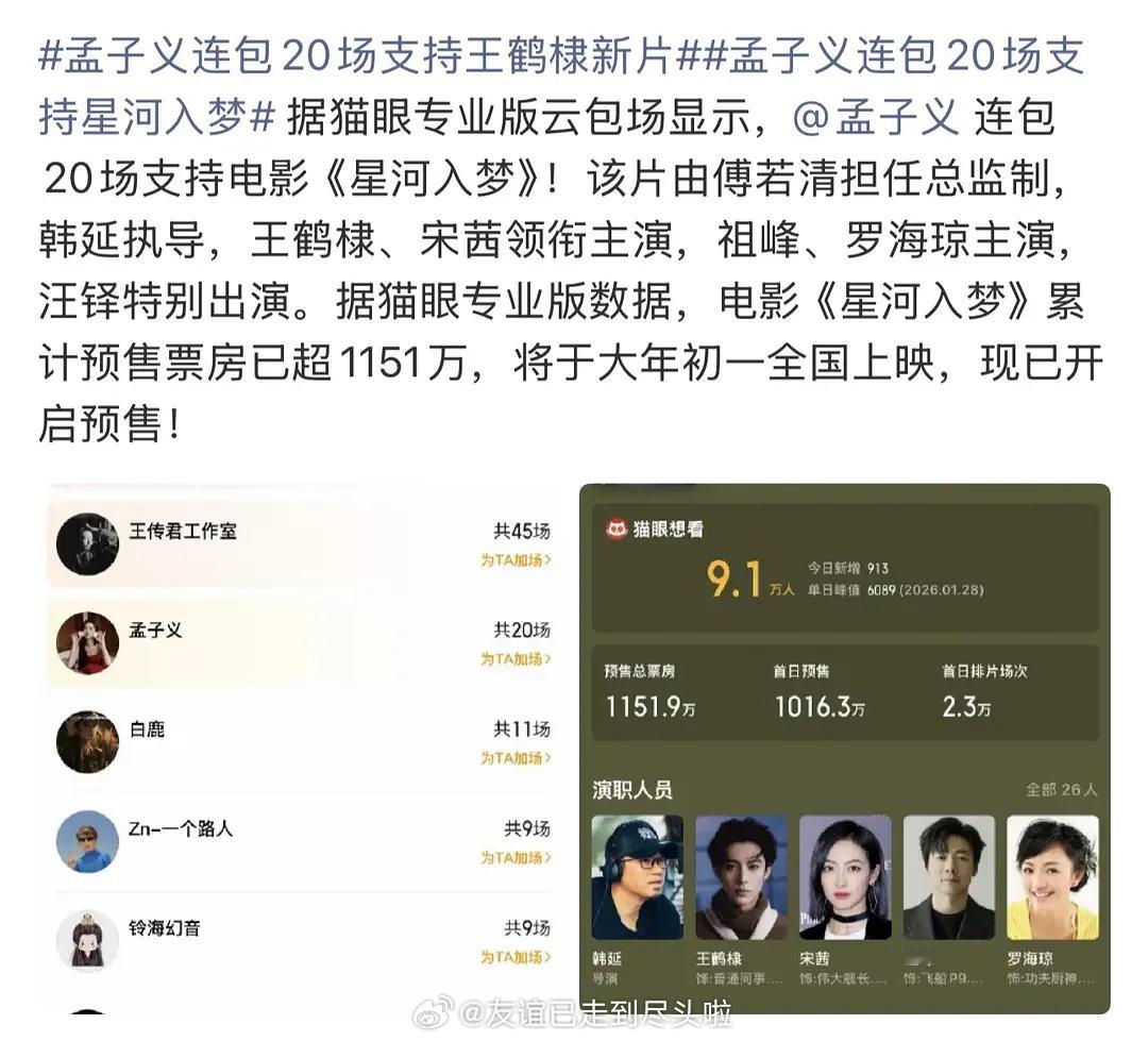 孟子义给王鹤棣宋茜电影《星河入梦》包场了,包了20场。将门毒后还没官宣就包场,天