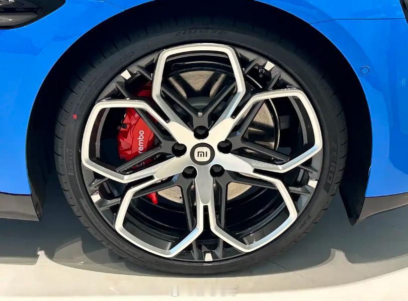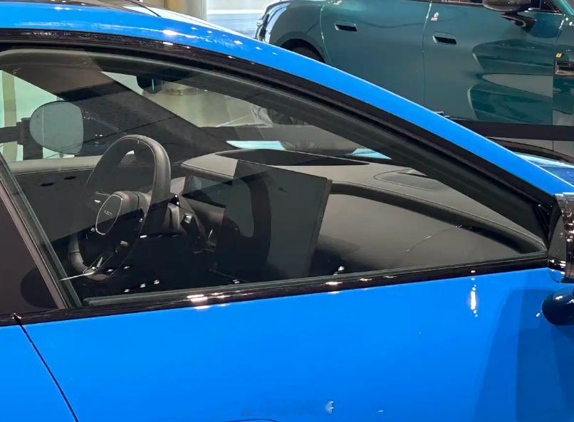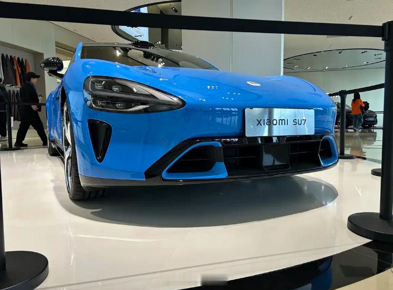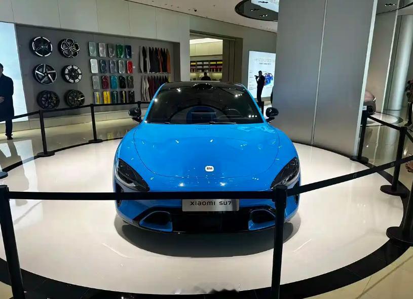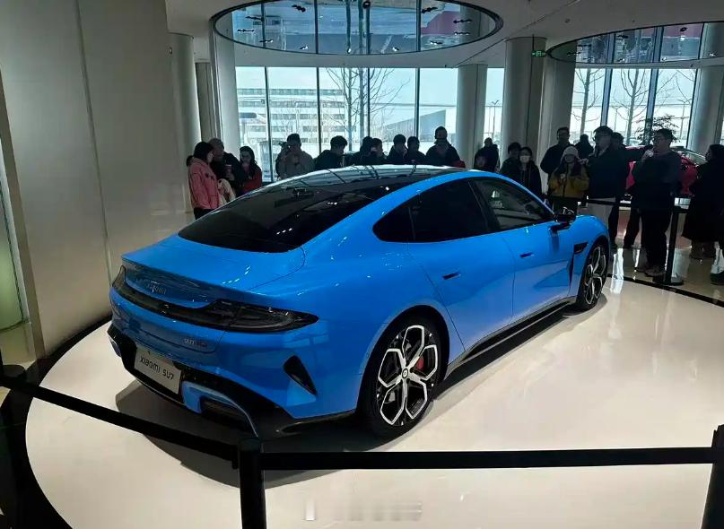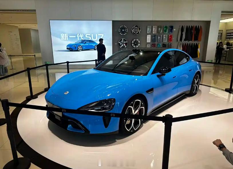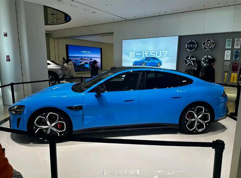 展厅中的这一辆新一代小米SU7就是“卡布里蓝”,这个颜色的实车的颜值很能打。目前还不让上车,是被围了起来。