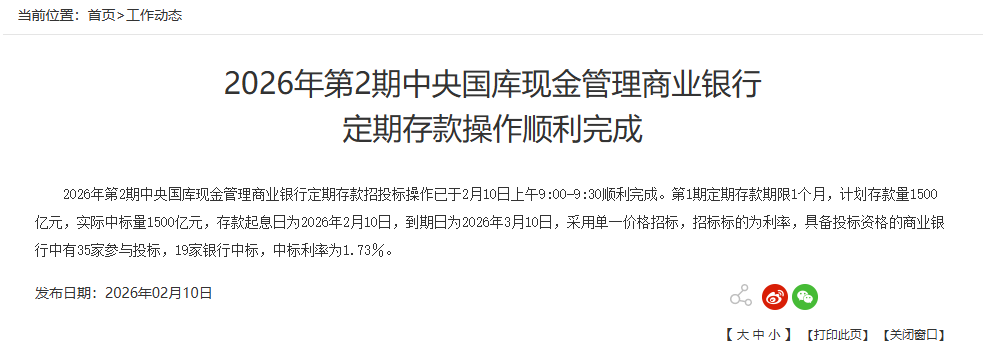 2月10日,财政部发布公告,2026年第2期中央国库现金管理商业银行定期存款招投标操作已于2月10日上午9:00~9:30顺利完成。第1期定期存款期限1个月,计划存款量1500亿元,实际中标量1500亿元,存款起息日为2026年2月10日,到期日为2026年3月10日,采用单一价格招标,招标标的为利率,具备投标资格的商业银行中有35家参与投标,19家银行中标,中标利率为1.73%。