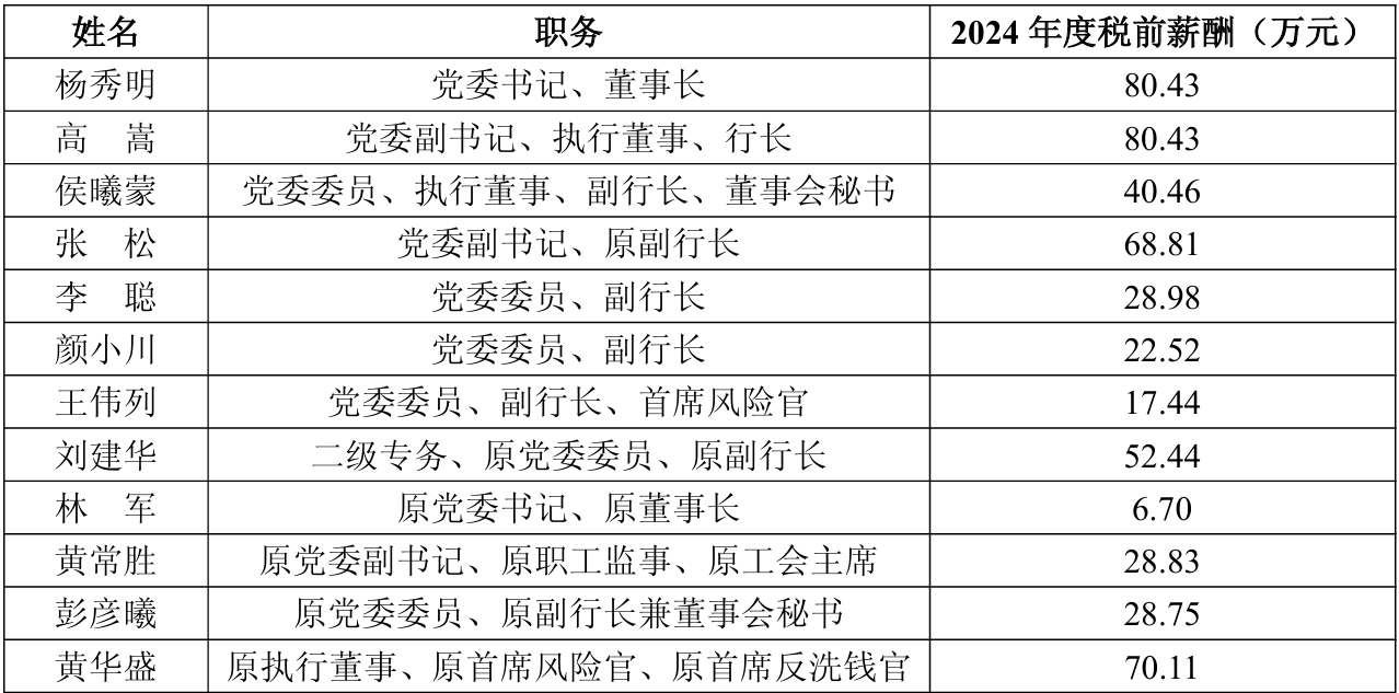 公告指出,公司党委书记兼董事长杨秀明和党委副书记、执行董事兼行长高嵩2024年度税前薪酬均为80.43万元,具体数据如下: