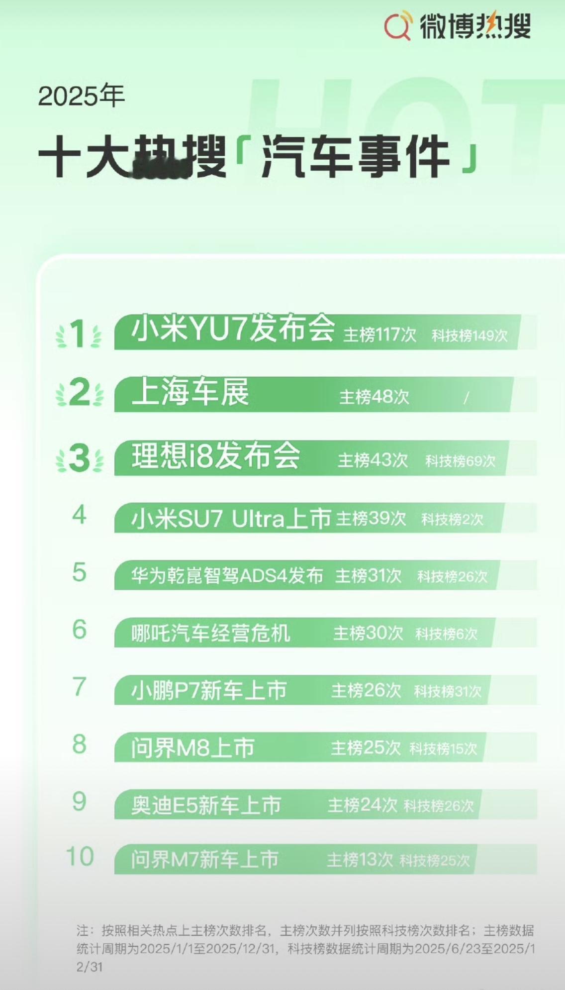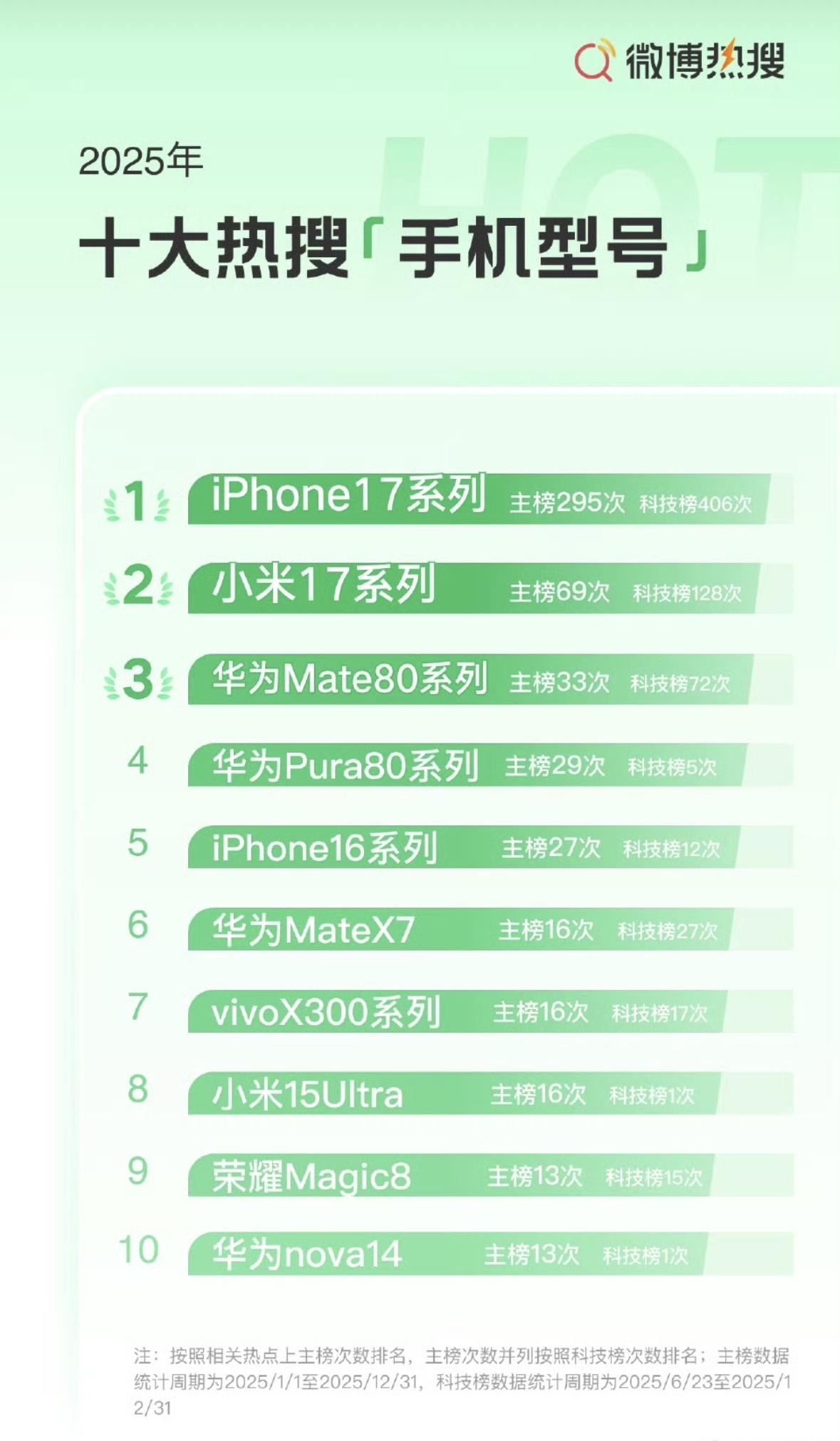 2025年十大热搜手机品牌: 苹果,891次 华为,271次 小米,259次 2025年十大热搜汽车品牌: 小米汽车,326次 鸿蒙智行,220次 特斯拉,120次 iPhone 17系列上了295次热搜,从发布到2025年结束,平均每天上热搜2.61次。。。。
