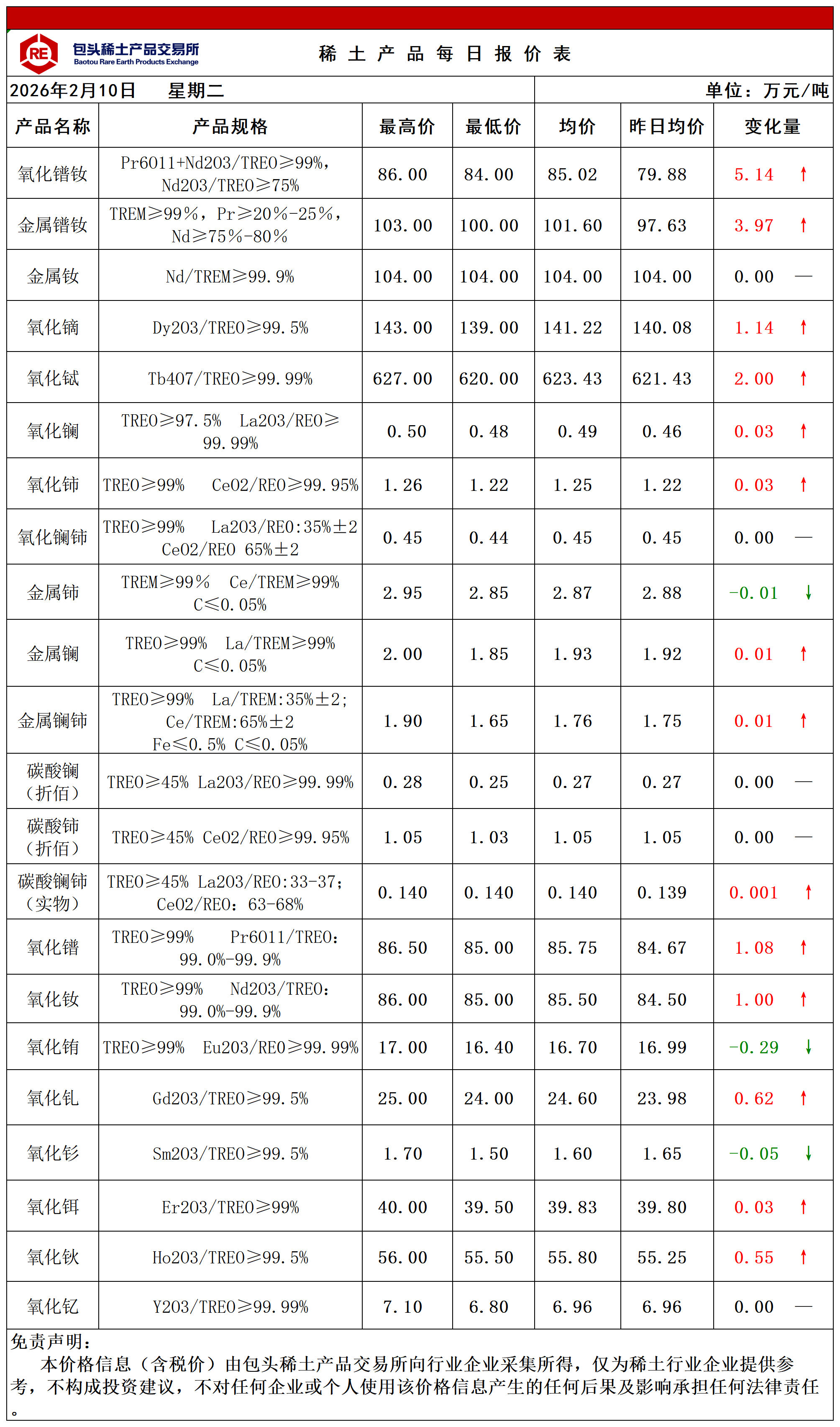据包头稀土产品交易所消息,今日(2月10日)稀土主流产品价格整体上行。氧化镨钕均价85.02万元/吨,上涨5.14万元/吨;金属镨钕均价101.60万元/吨,上涨3.97万元/吨;氧化镝均价141.22万元/吨,上涨1.14万元/吨;氧化铽均价623.43万元/吨,上涨2.00万元/吨。